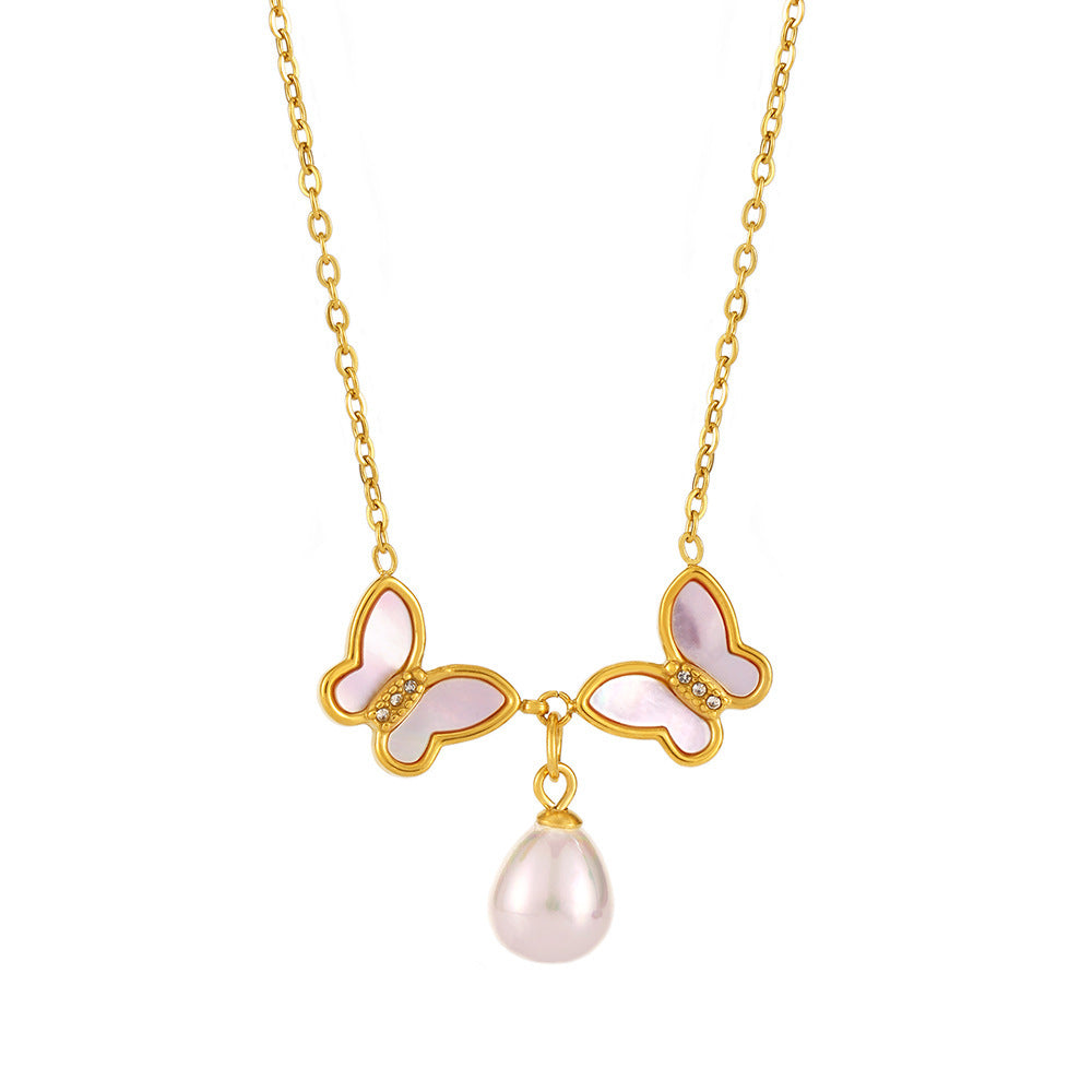 B廠【P2142】不鏽鋼天然貝殼雙蝴蝶鑲鑽貝珠鎖骨項鍊PVD電鍍18K真金飾品 25.01-1