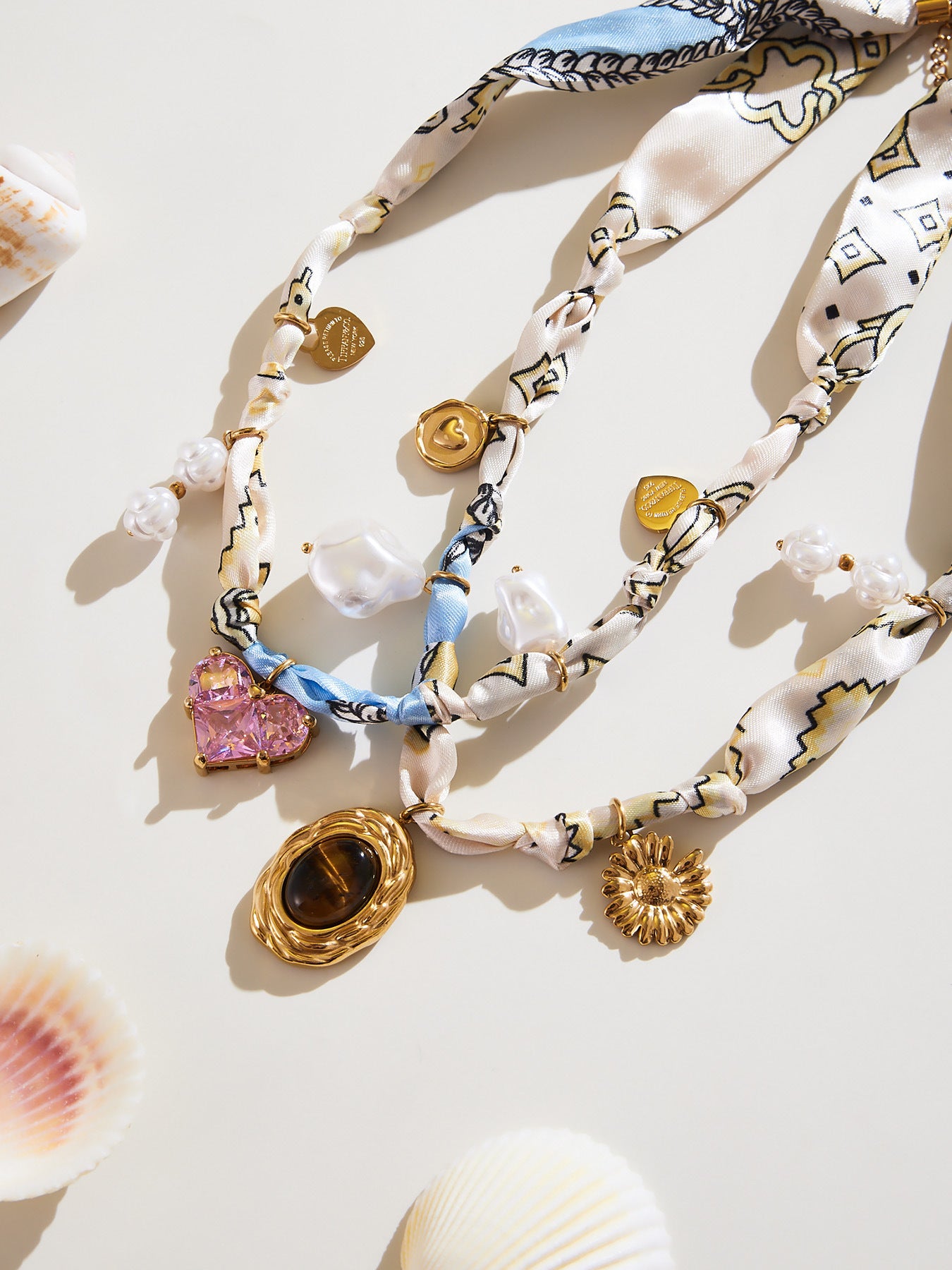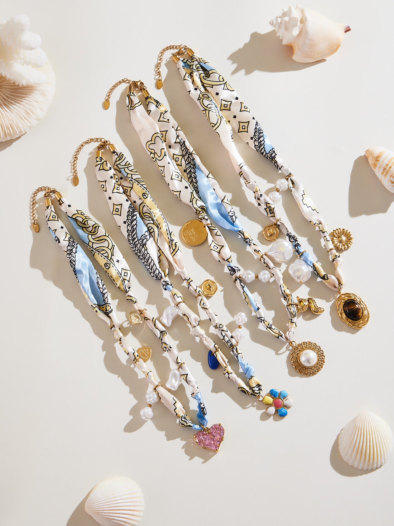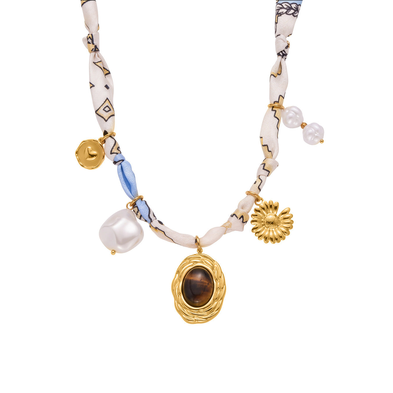 B廠【P2181】 diy絲巾項鍊 虎眼石仿珍珠頸鍊 小眾設計感打結布條飾品 25.10-2