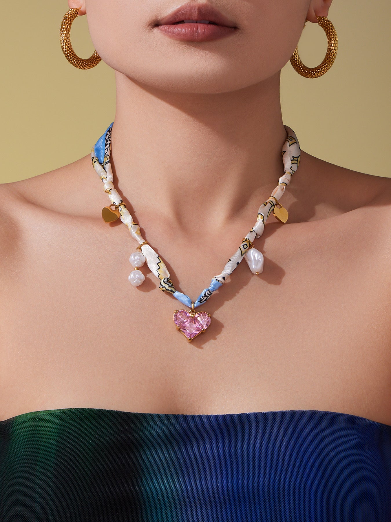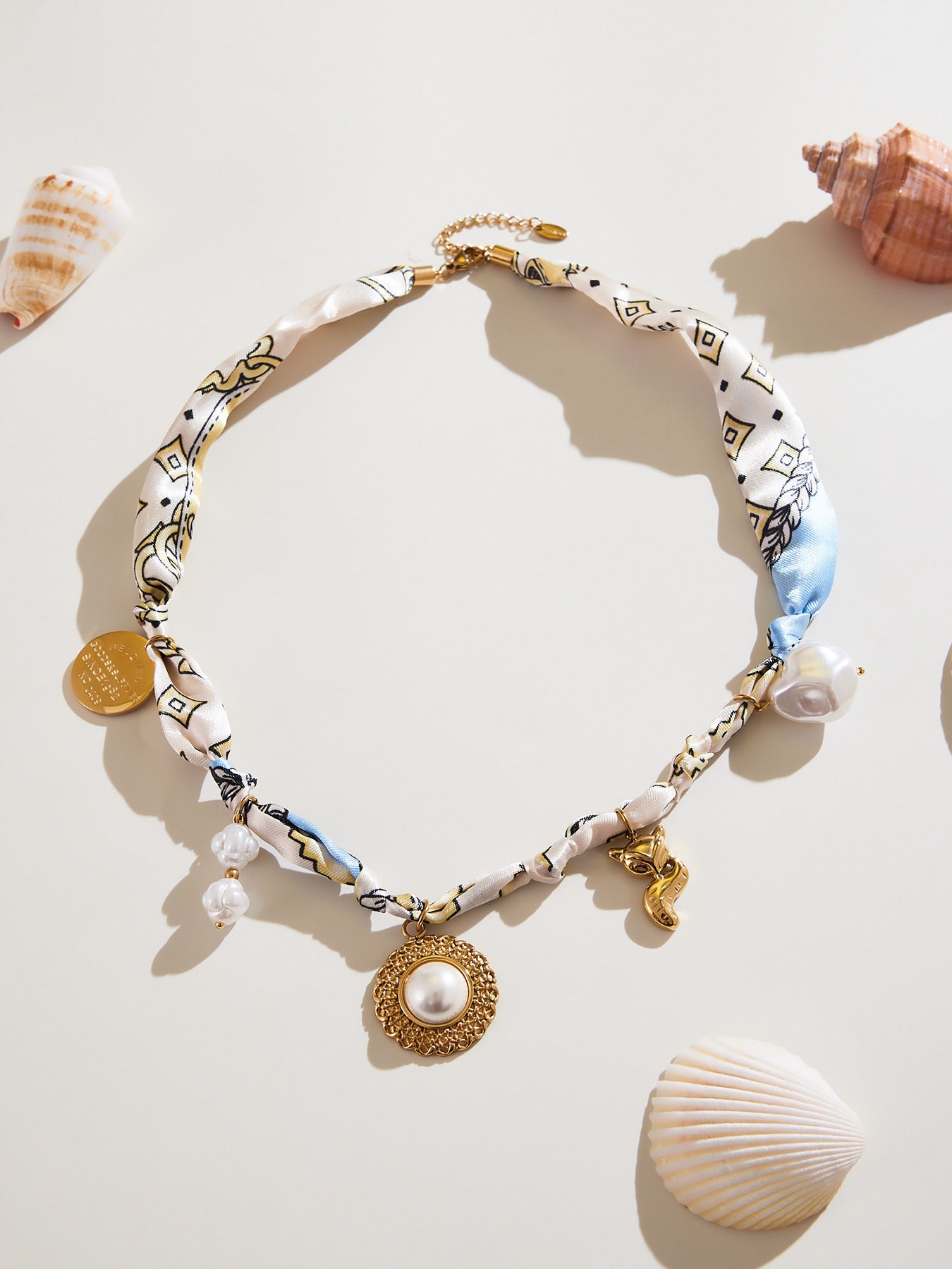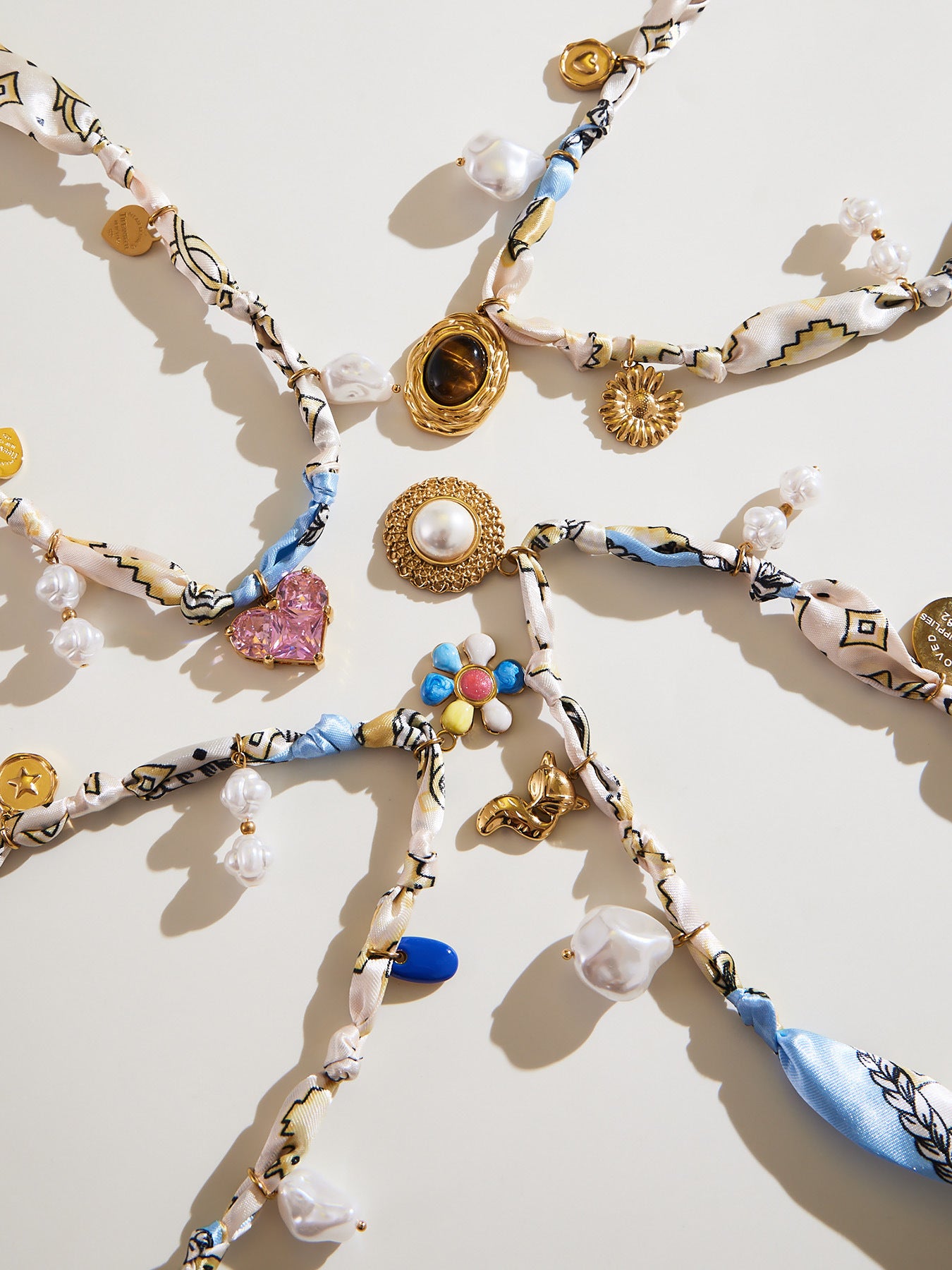B廠【P2181】 diy絲巾項鍊 虎眼石仿珍珠頸鍊 小眾設計感打結布條飾品 25.10-2