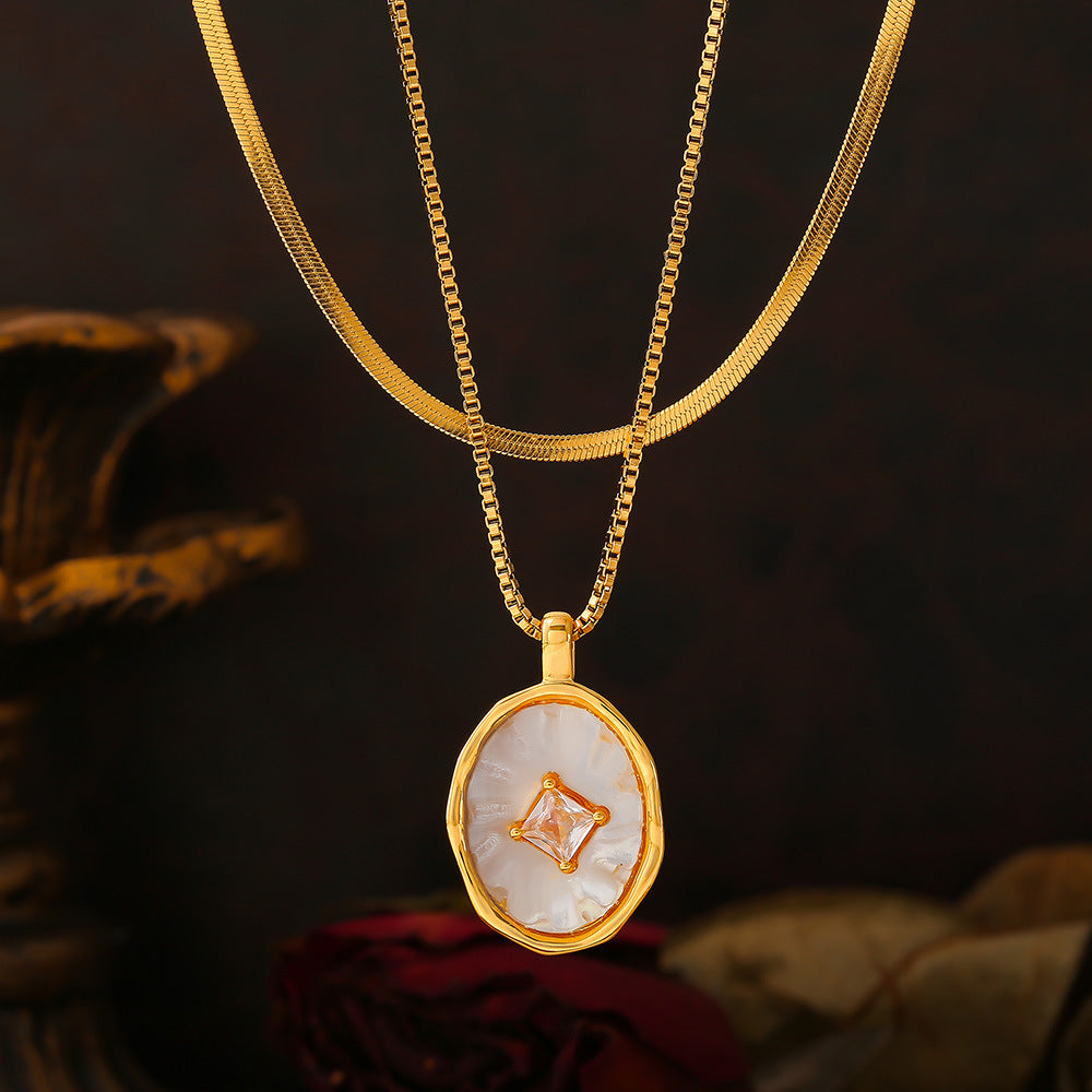 B廠【P550】法式marka復古橢圓貝母鑲鋯石銅製吊墜鈦鋼鎖骨鏈鍍18k真金疊戴風 24.08-3
