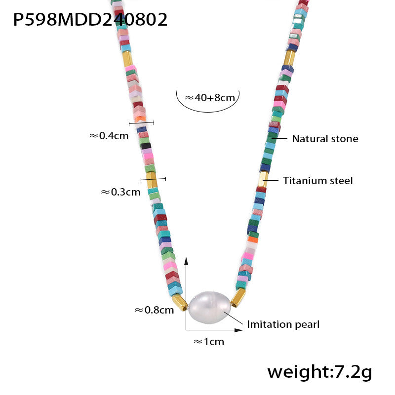 B廠【P598】赫本風新款幾何仿珍珠吊墜串彩色天然石方形切面項鍊鈦鋼鏈條配件 24.08-2