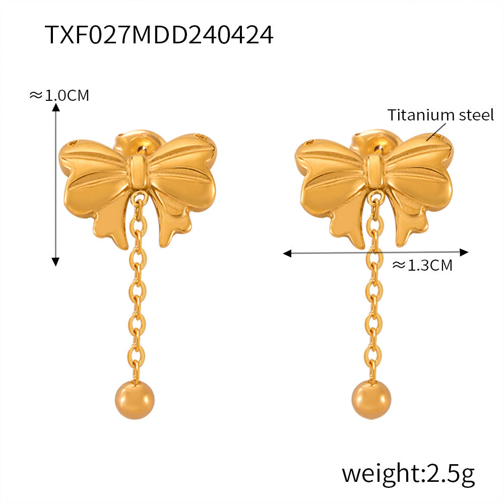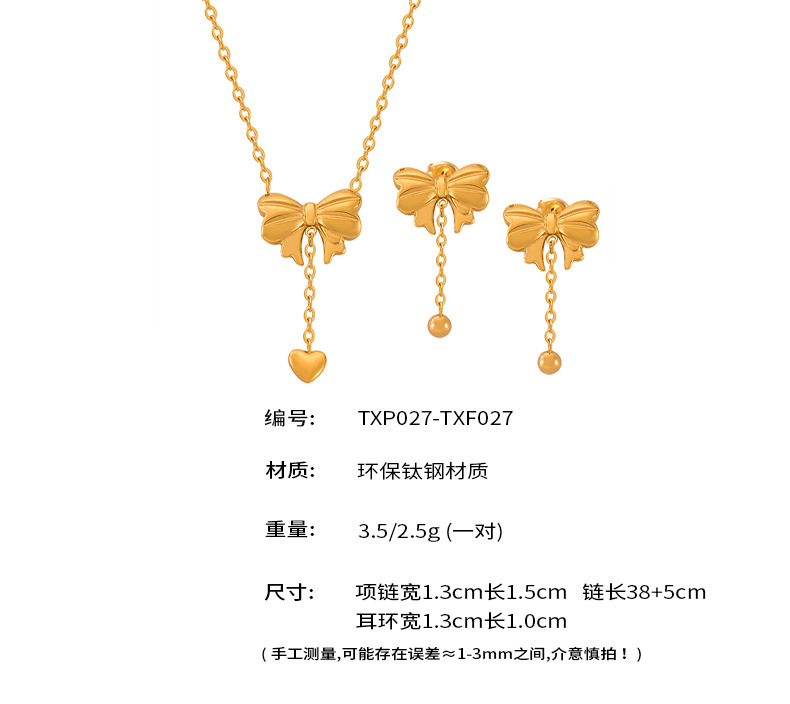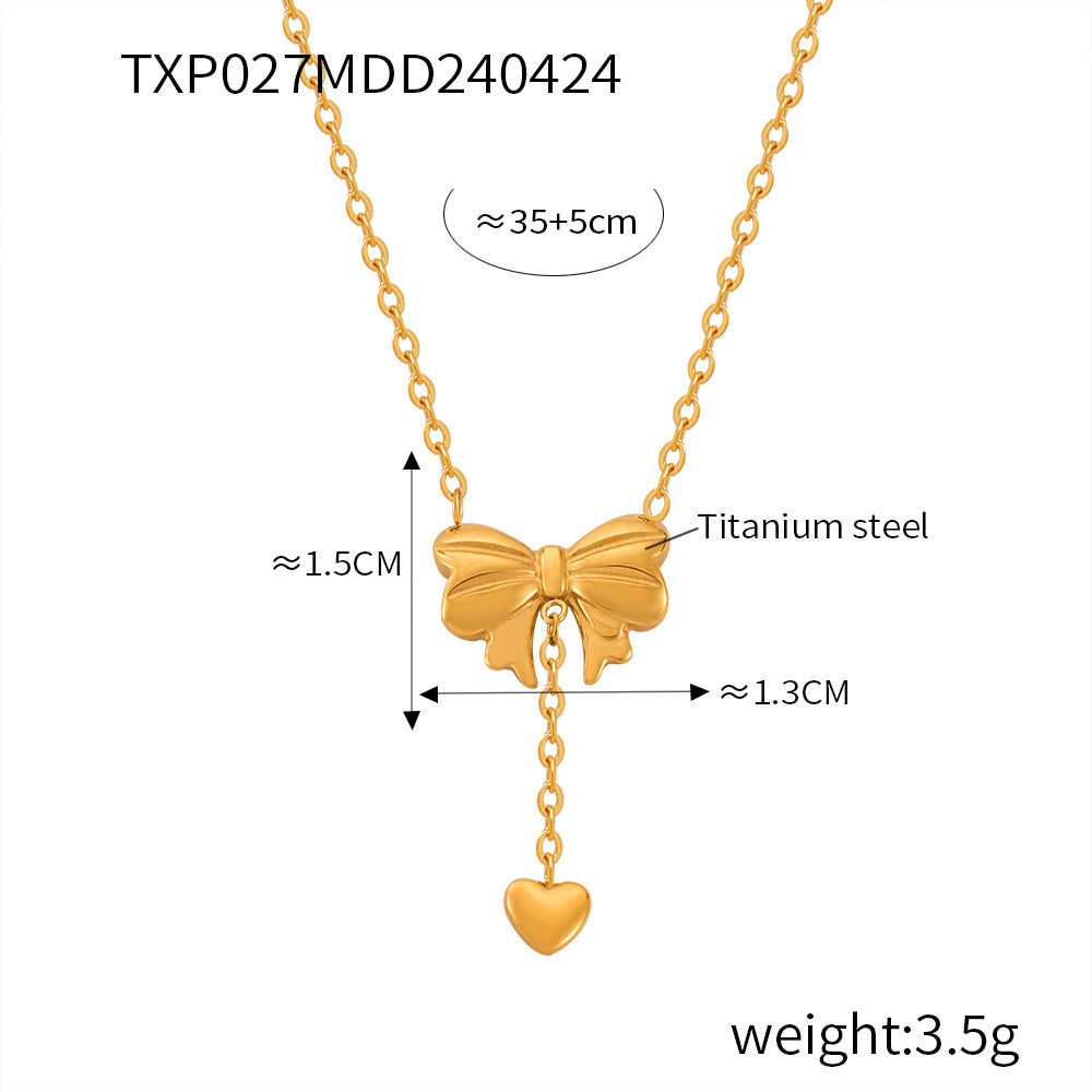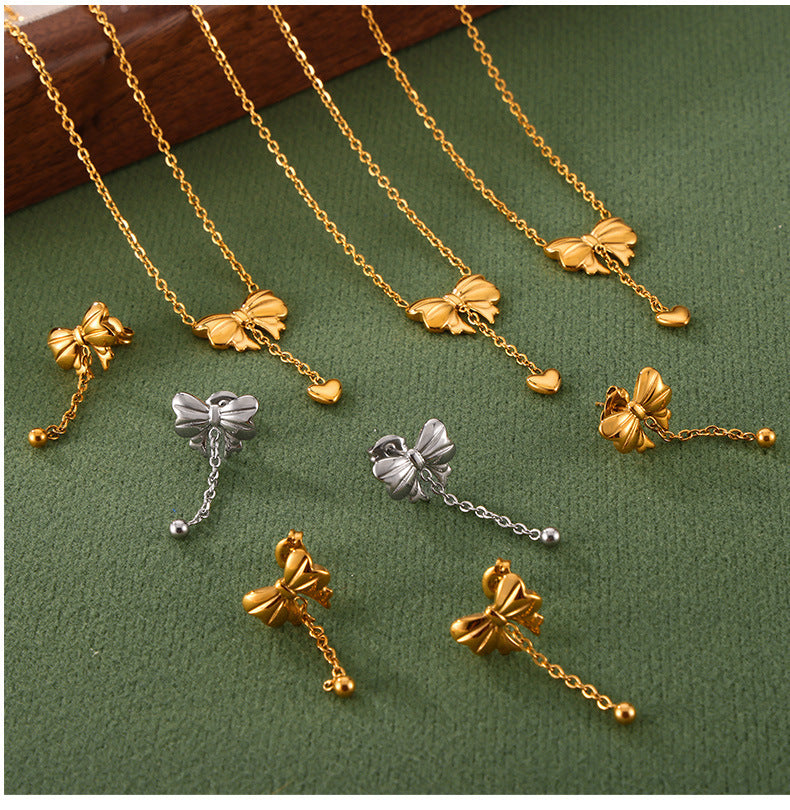 B廠【TXP027】歐美跨境蝴蝶結簡約個性項鍊女愛心長款流蘇吊墜鈦鋼耳環套裝 24.05-1