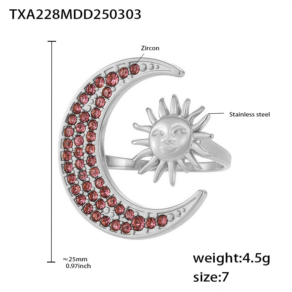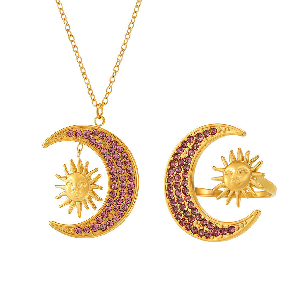 B廠【TXP228】日月同輝鑲嵌鋯石戒指鎖骨項鍊精緻創意鈦鋼18K金套裝飾品 25.03-1