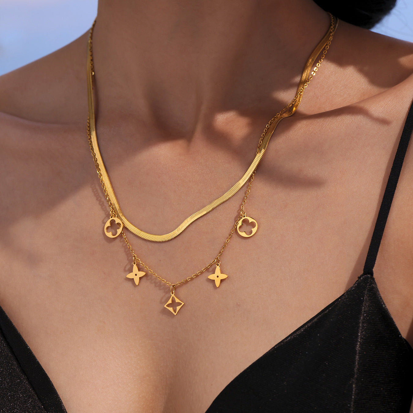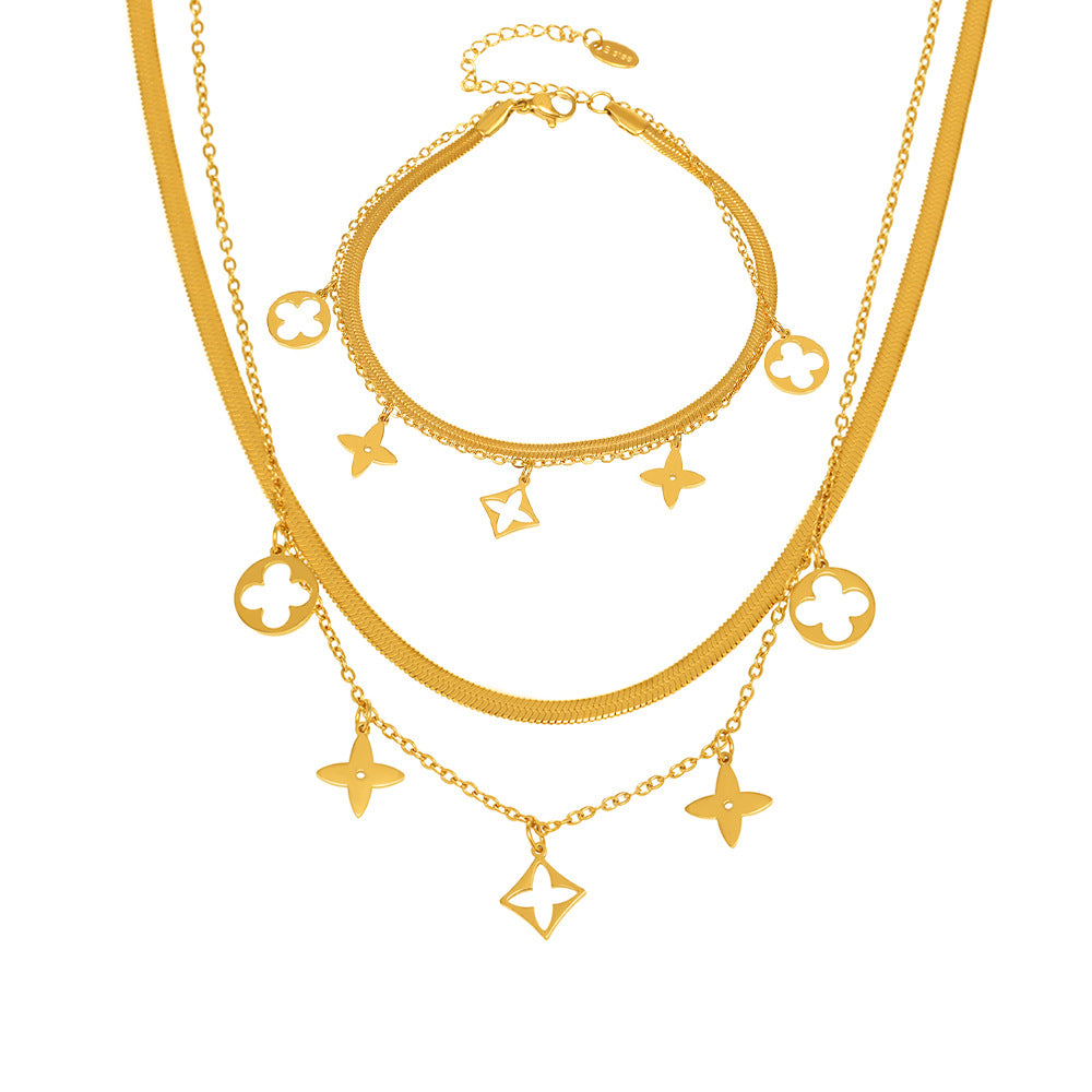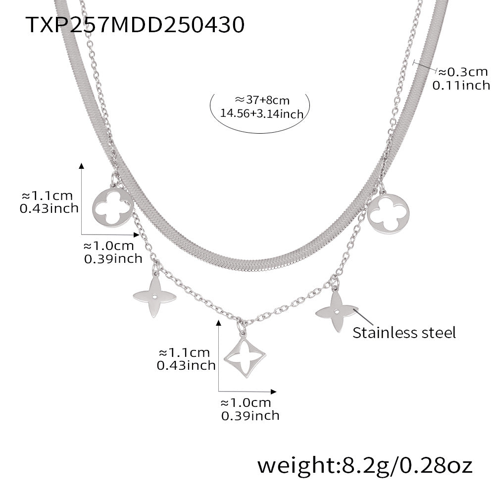 B廠【TXP257】不銹鋼刀片雙層疊戴項鍊鏤空老花設計多配件吊墜首飾套裝女 25.05-2