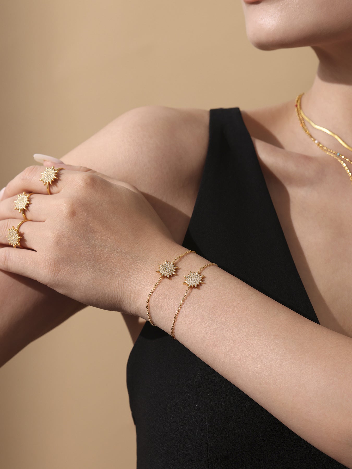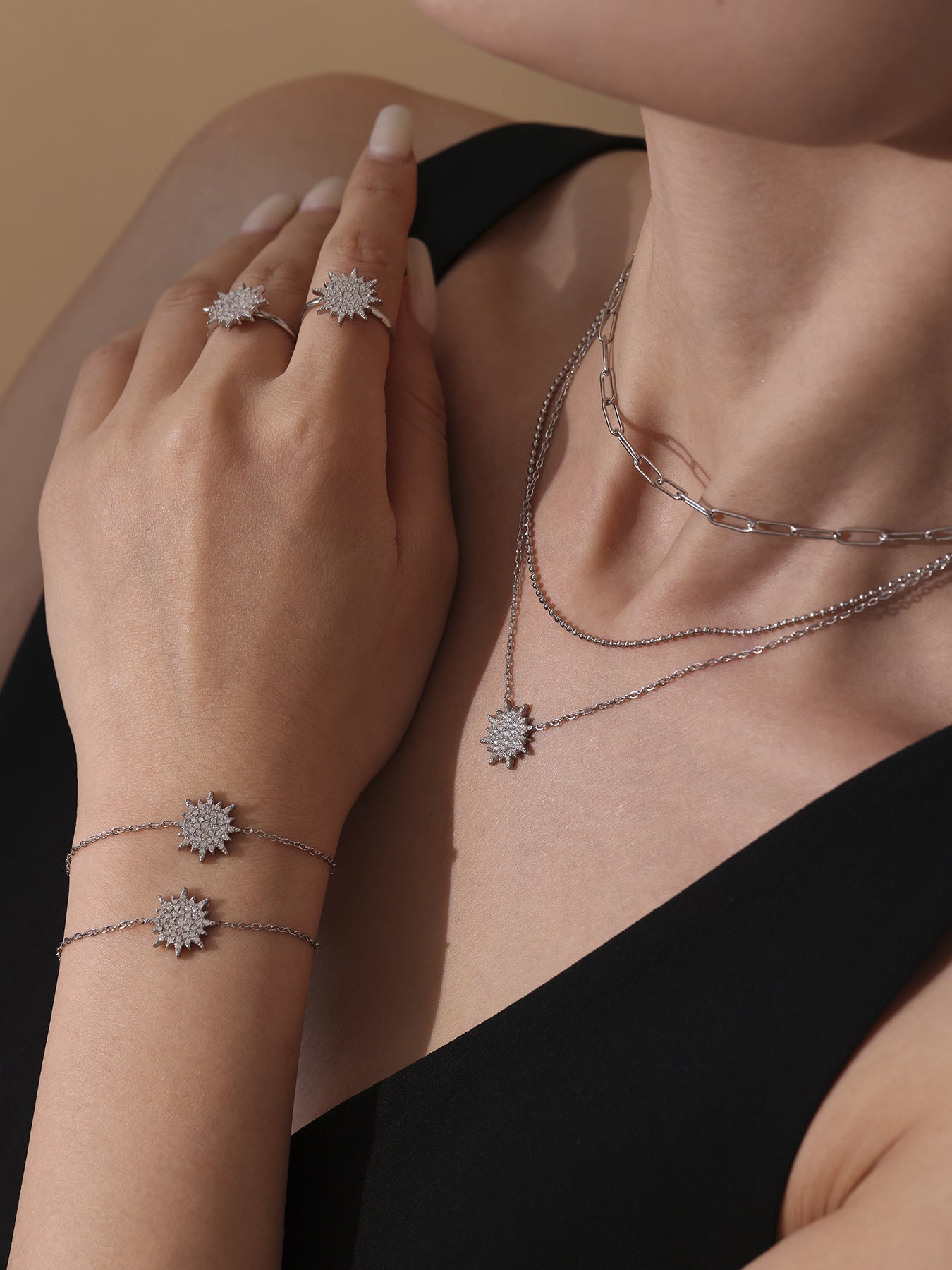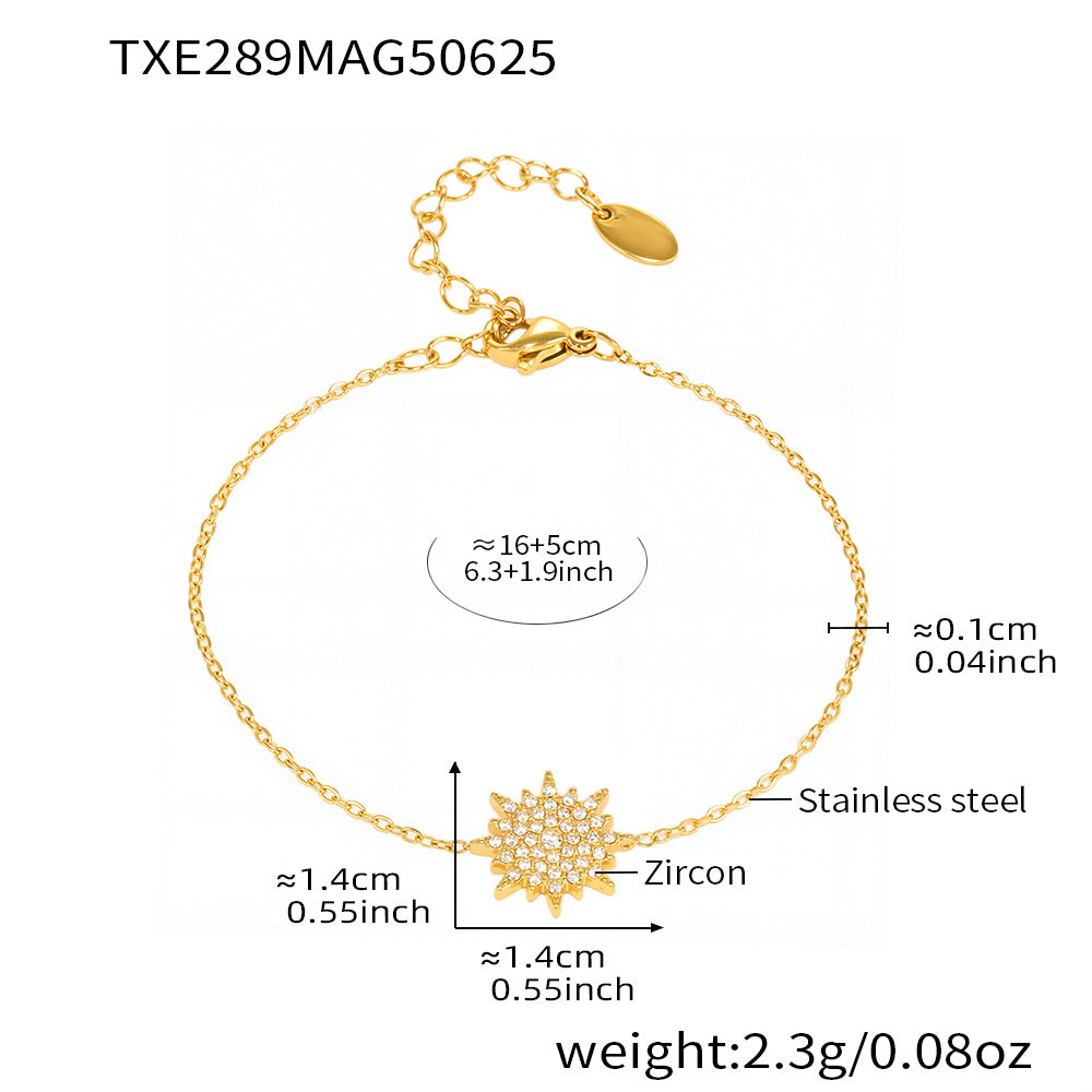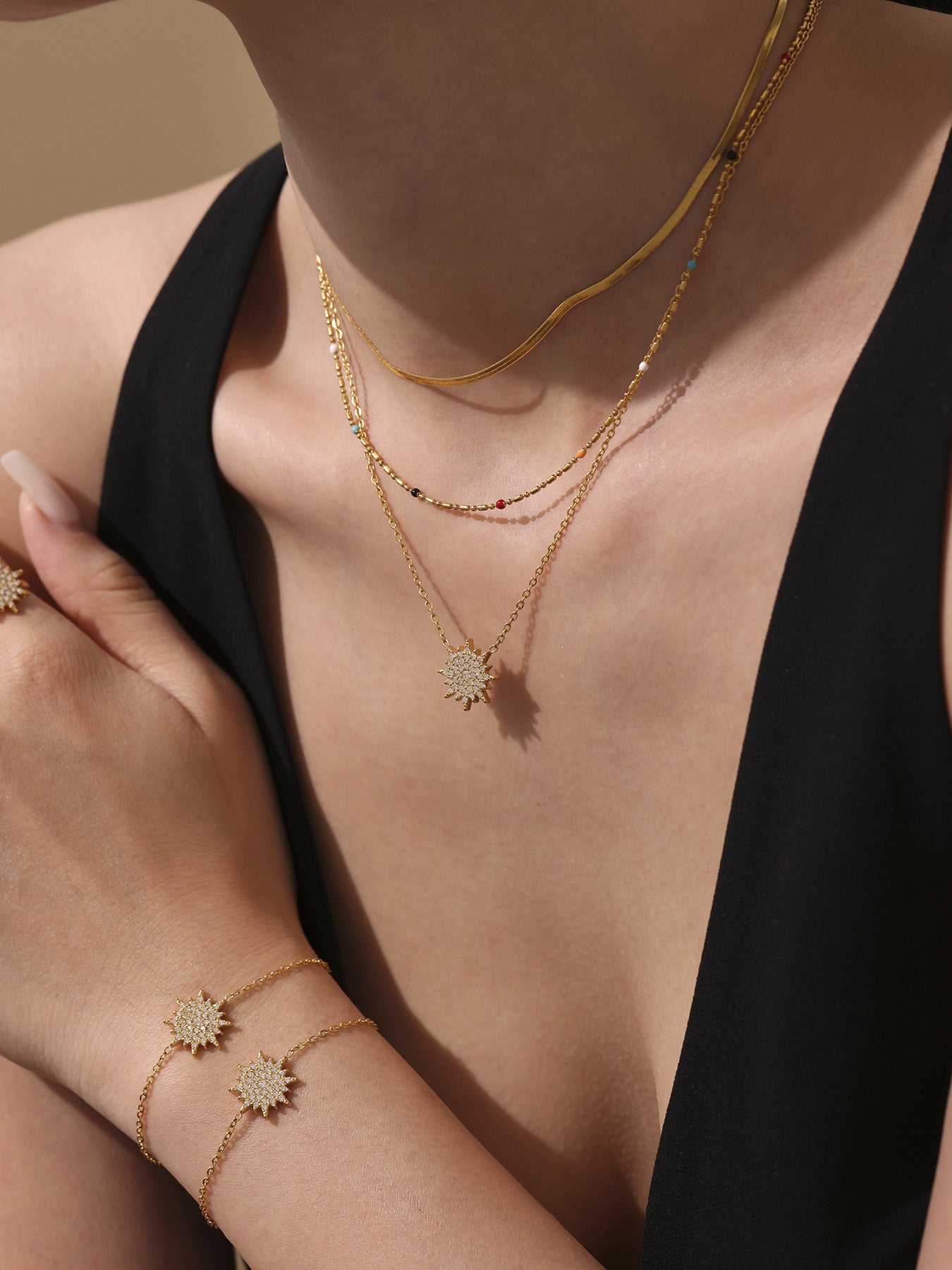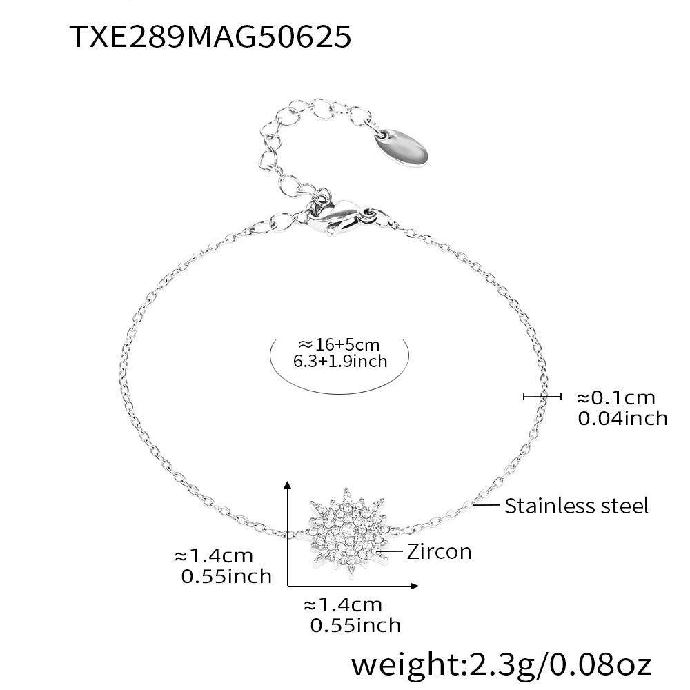 B廠【TXP289】超閃小太陽鑲嵌5A鋯石鎖骨雙層項鍊戒指組不銹鋼材質 25.07-1