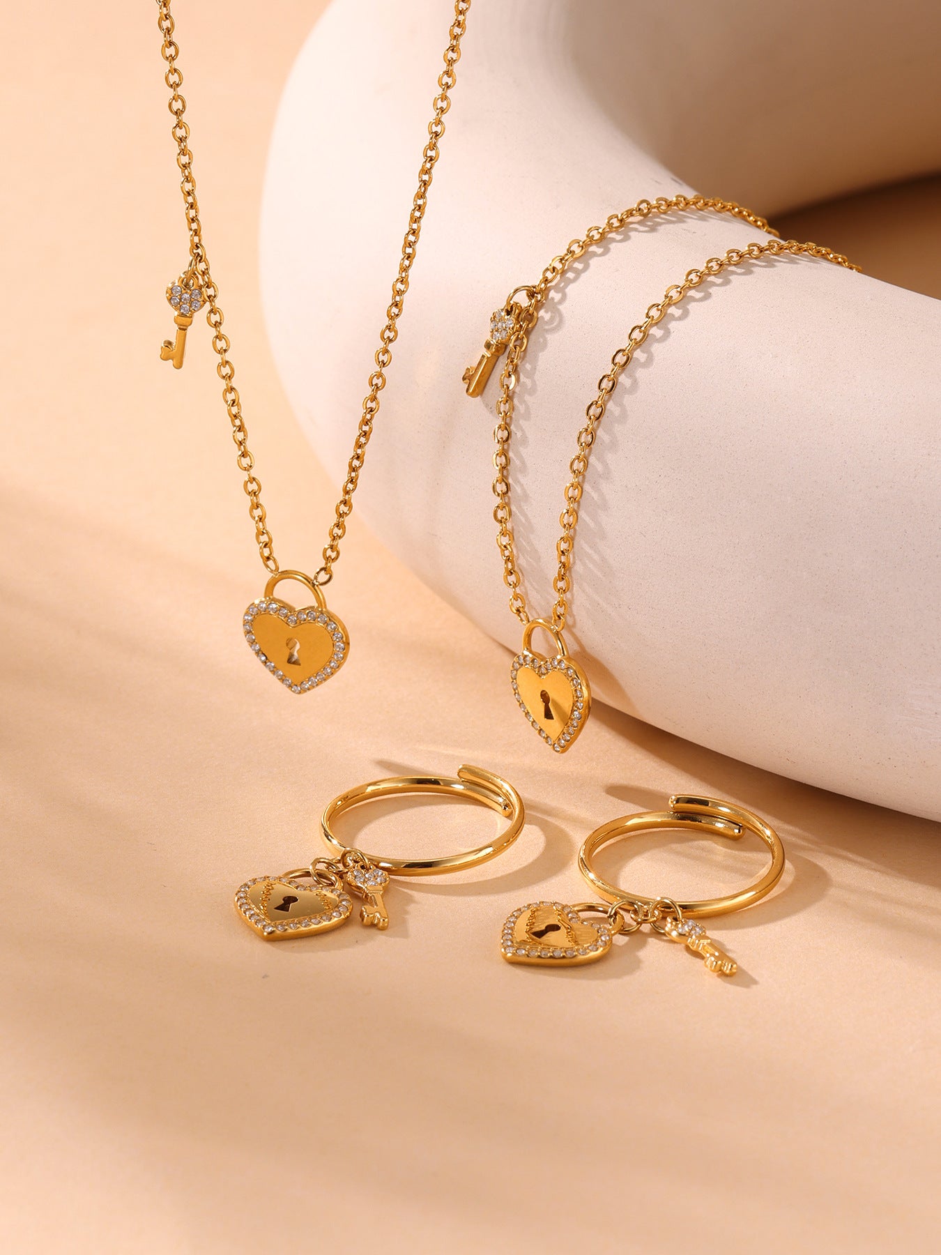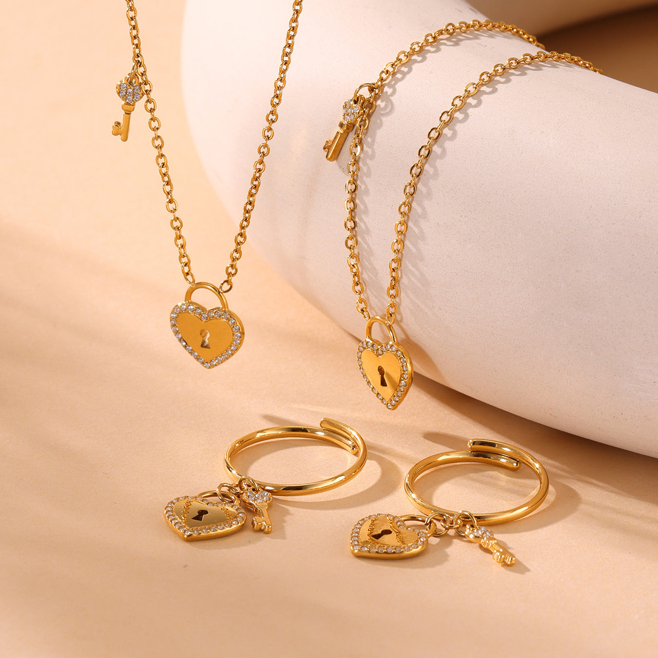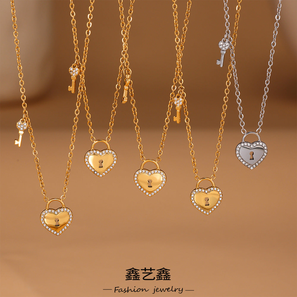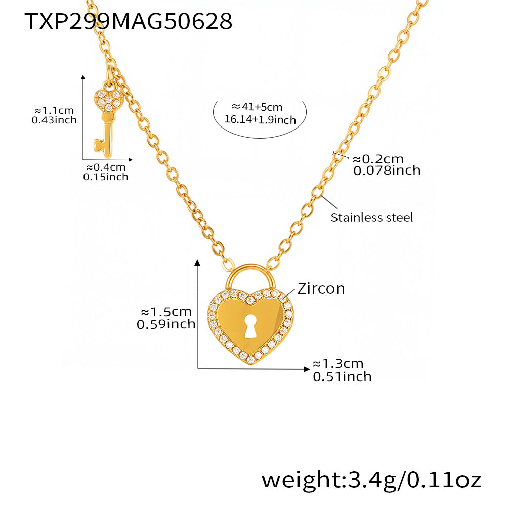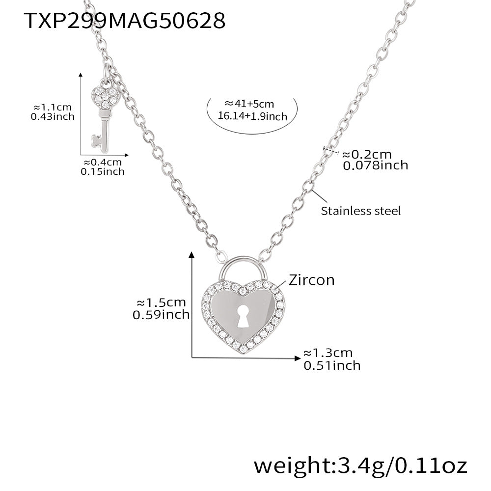 B廠【TXP299】歐美不銹鋼5A鋯石愛心鎖頭鑰匙棍吊墜鎖骨項鍊戒指飾品套裝 25.07-2