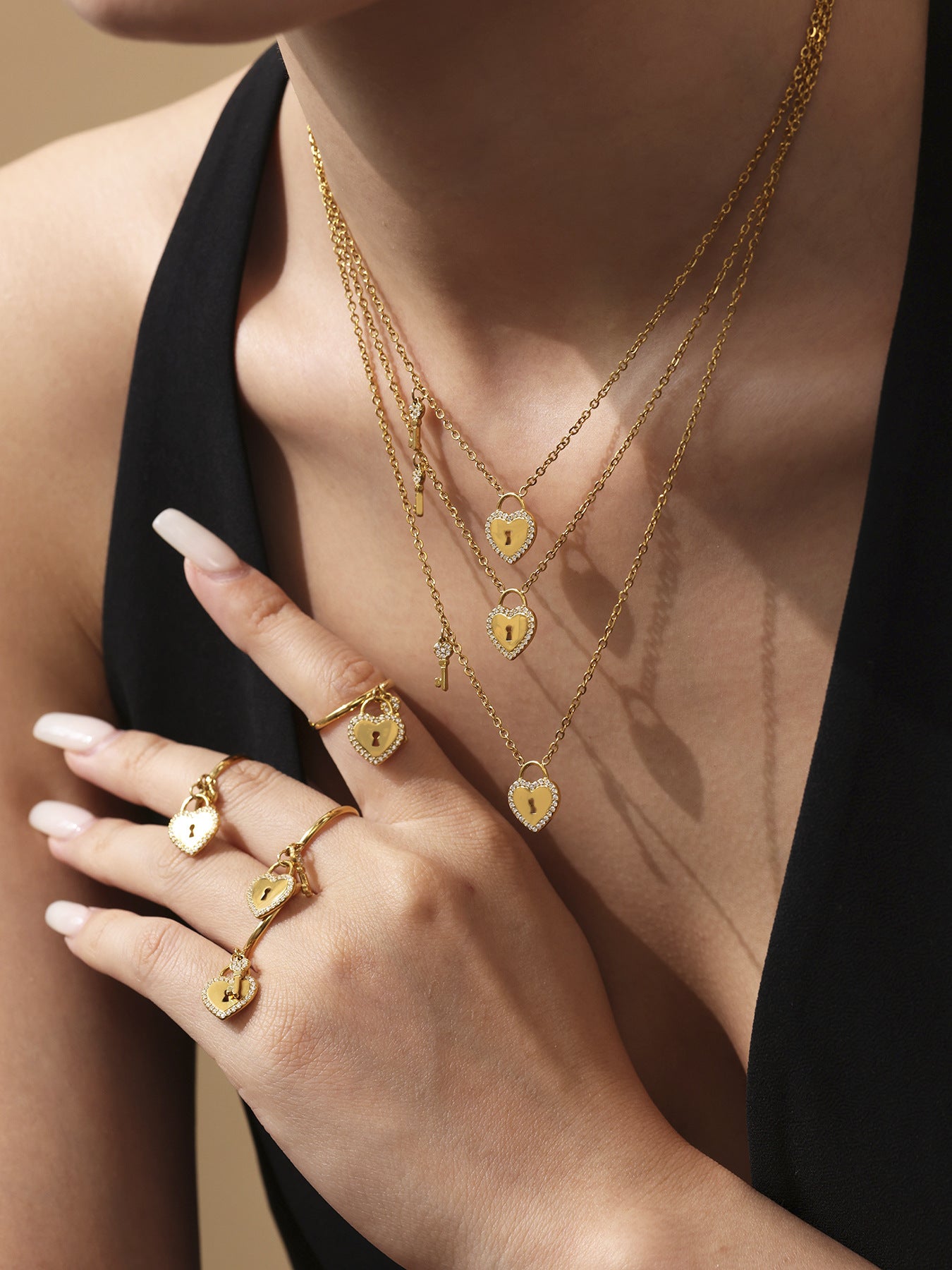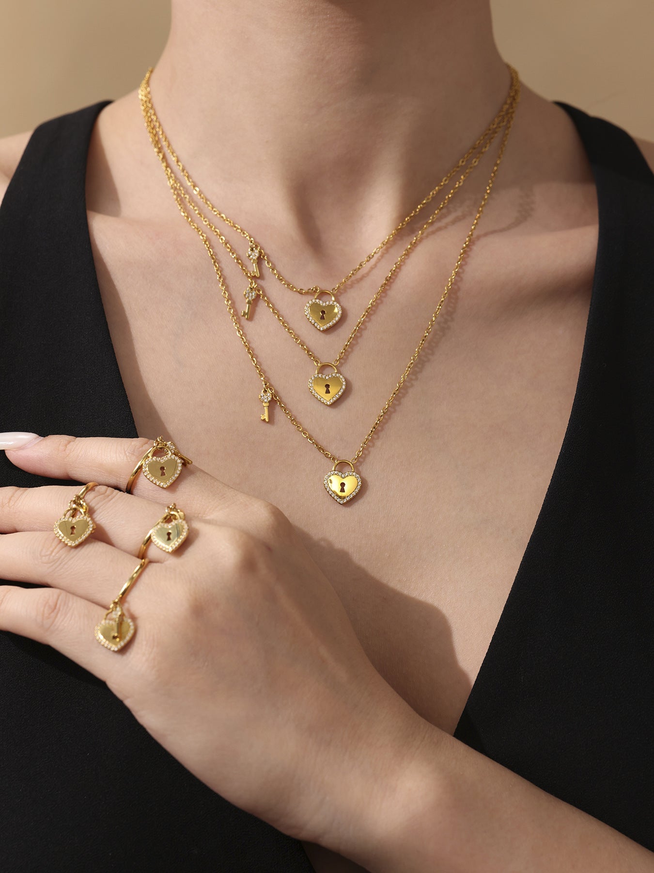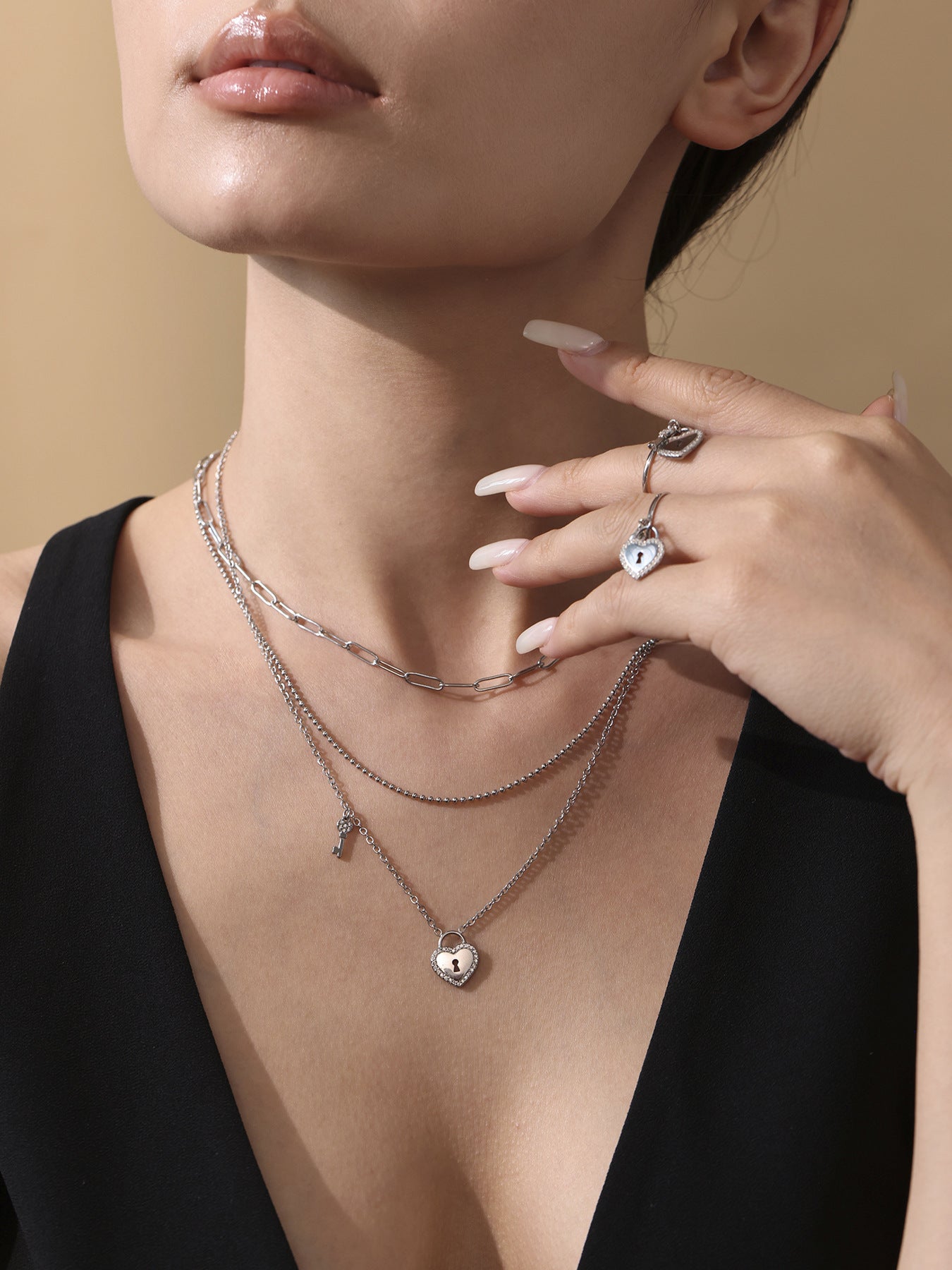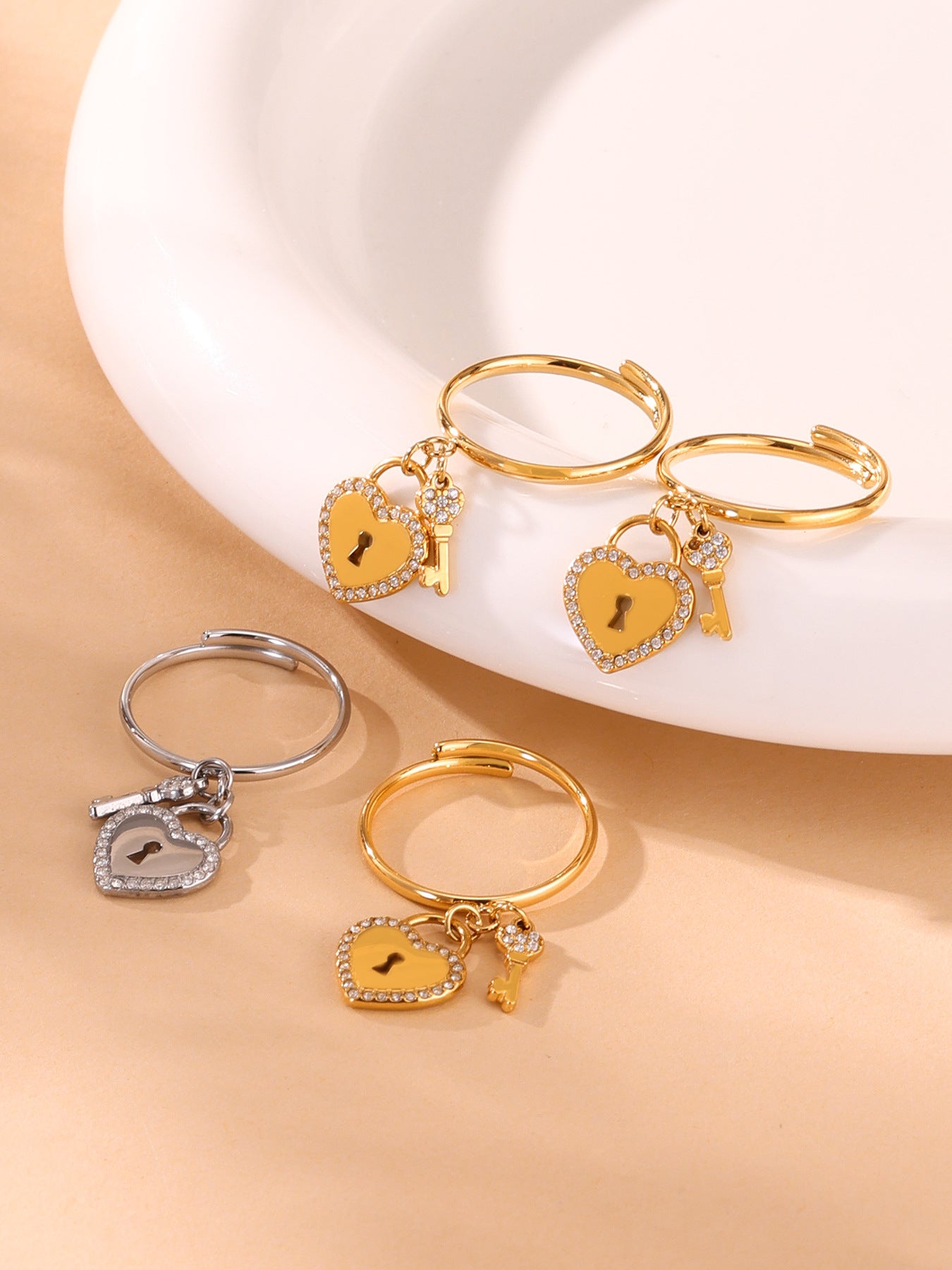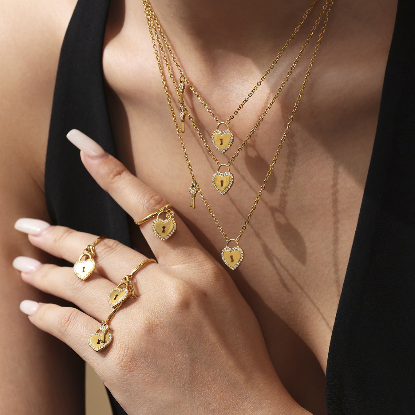 B廠【TXP299】歐美不銹鋼5A鋯石愛心鎖頭鑰匙棍吊墜鎖骨項鍊戒指飾品套裝 25.07-2