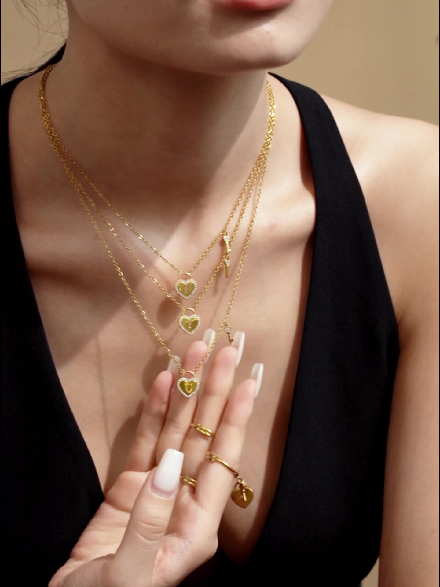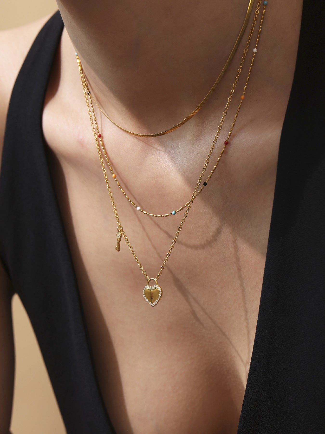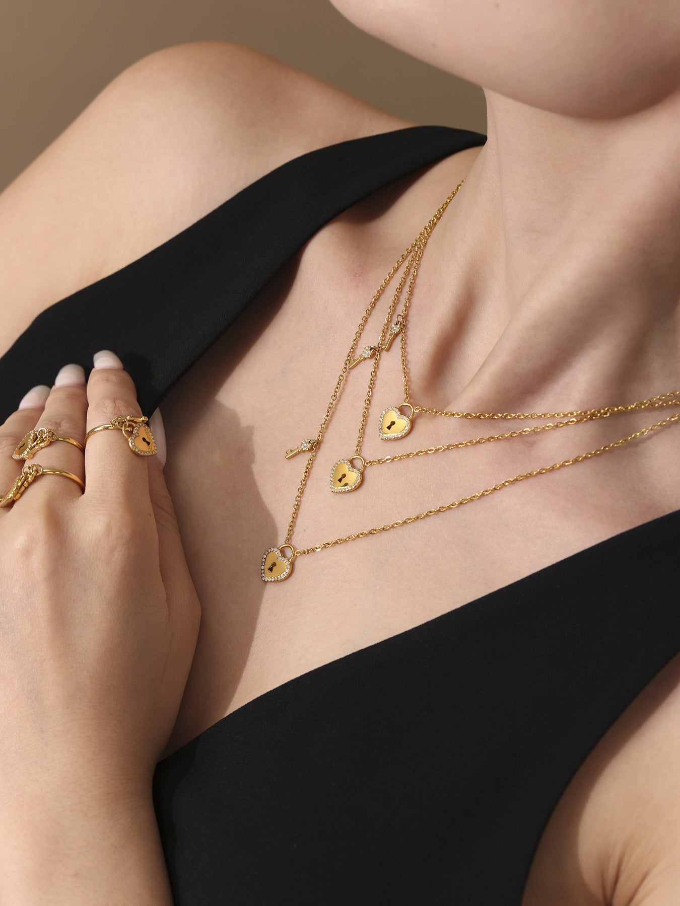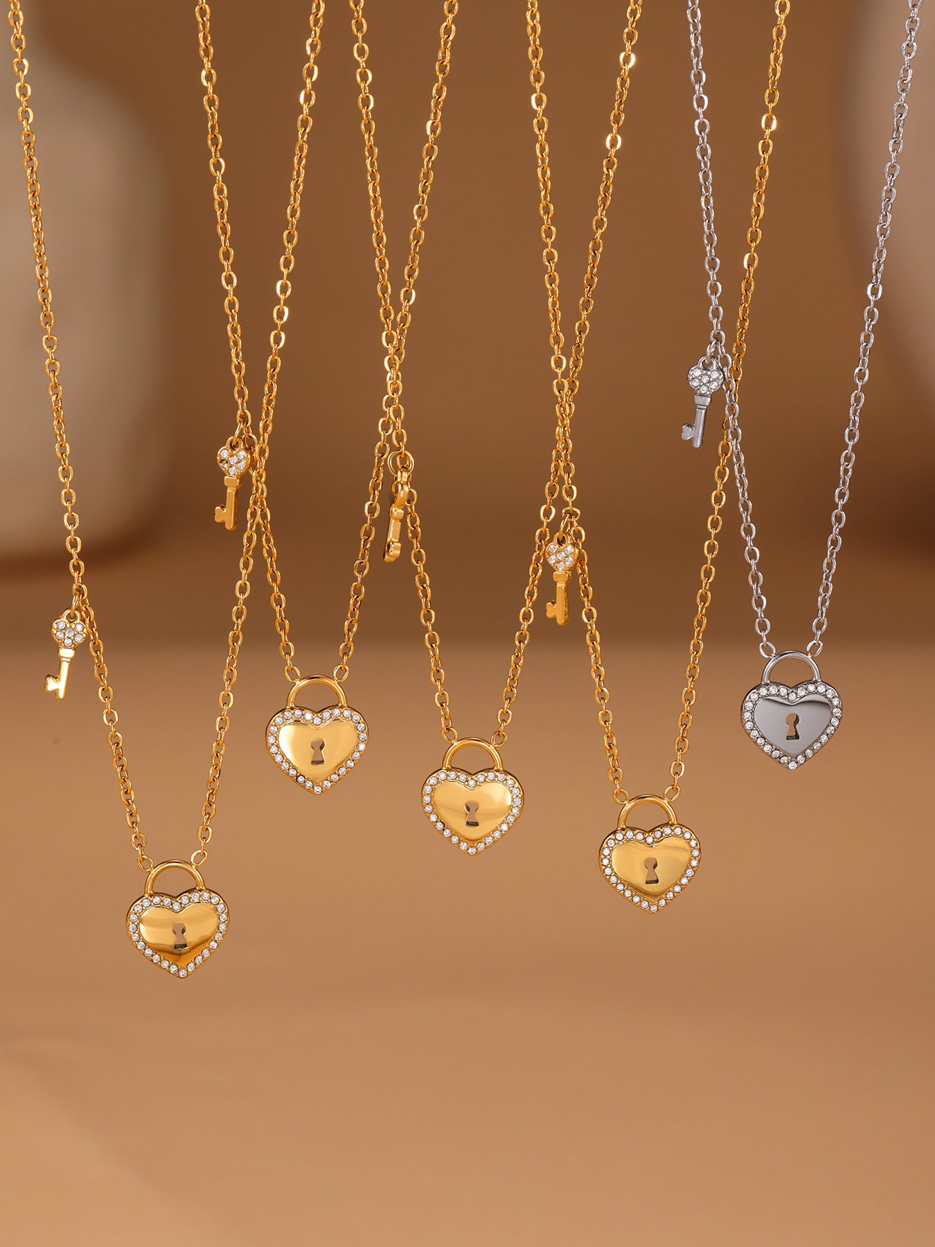 B廠【TXP299】歐美不銹鋼5A鋯石愛心鎖頭鑰匙棍吊墜鎖骨項鍊戒指飾品套裝 25.07-2