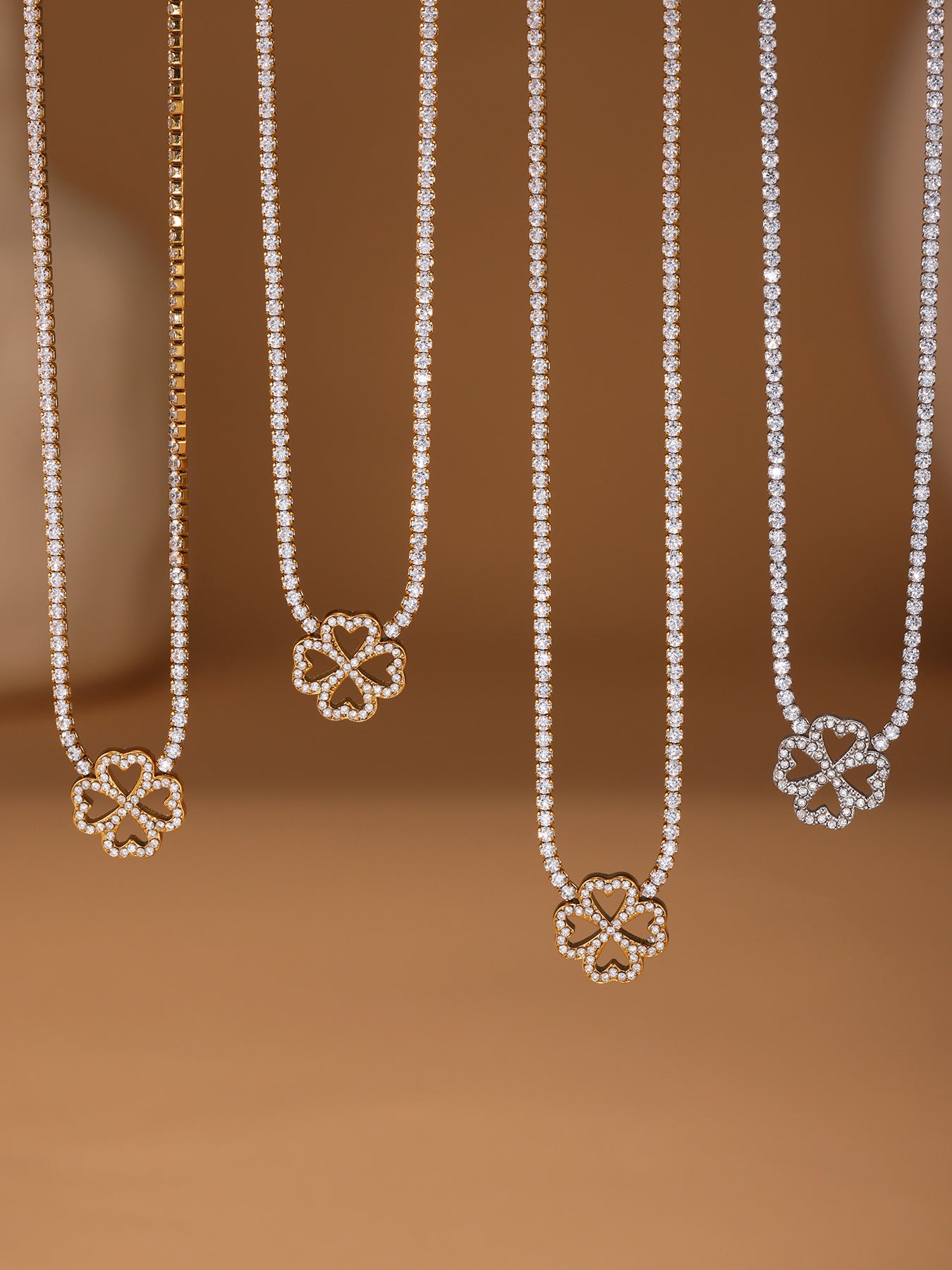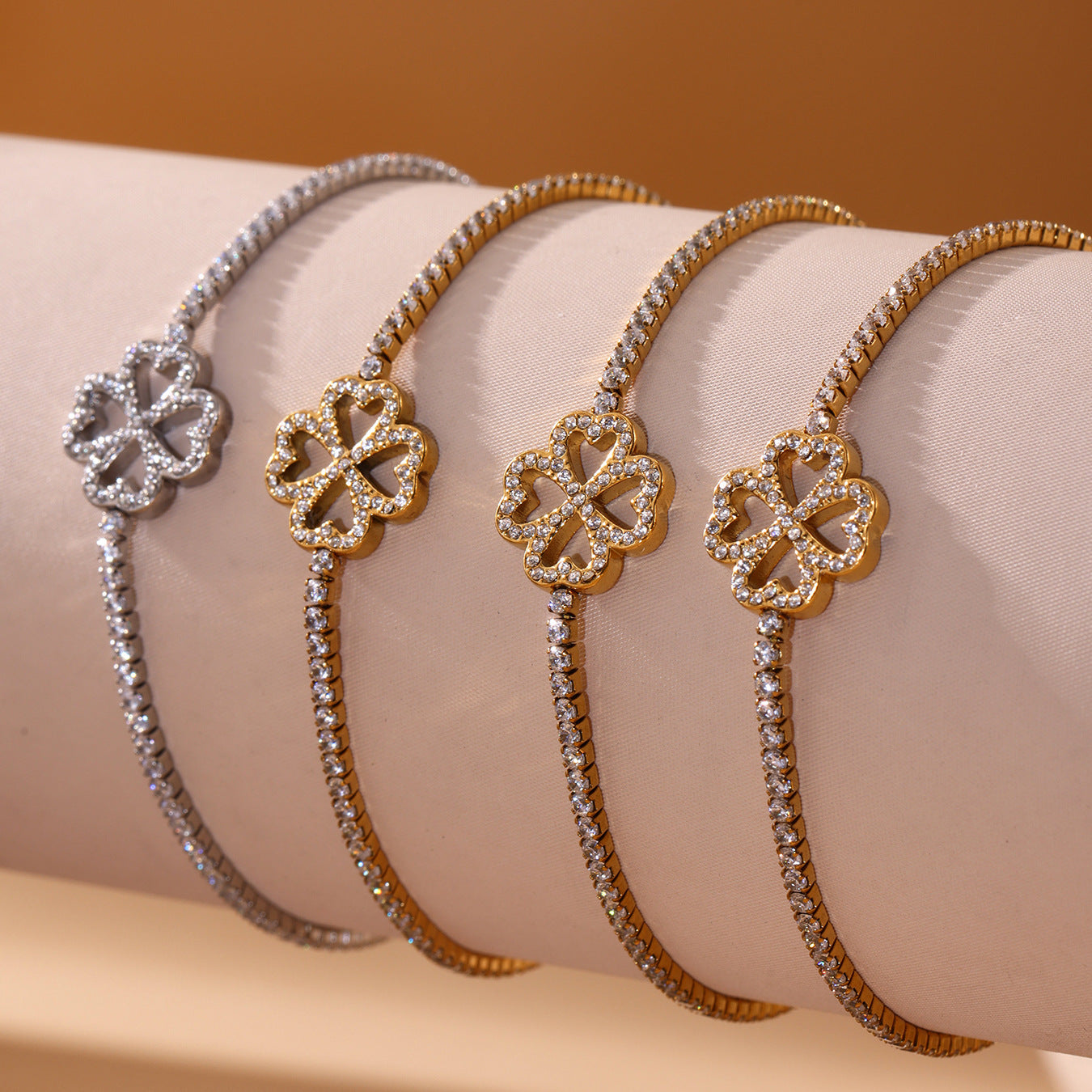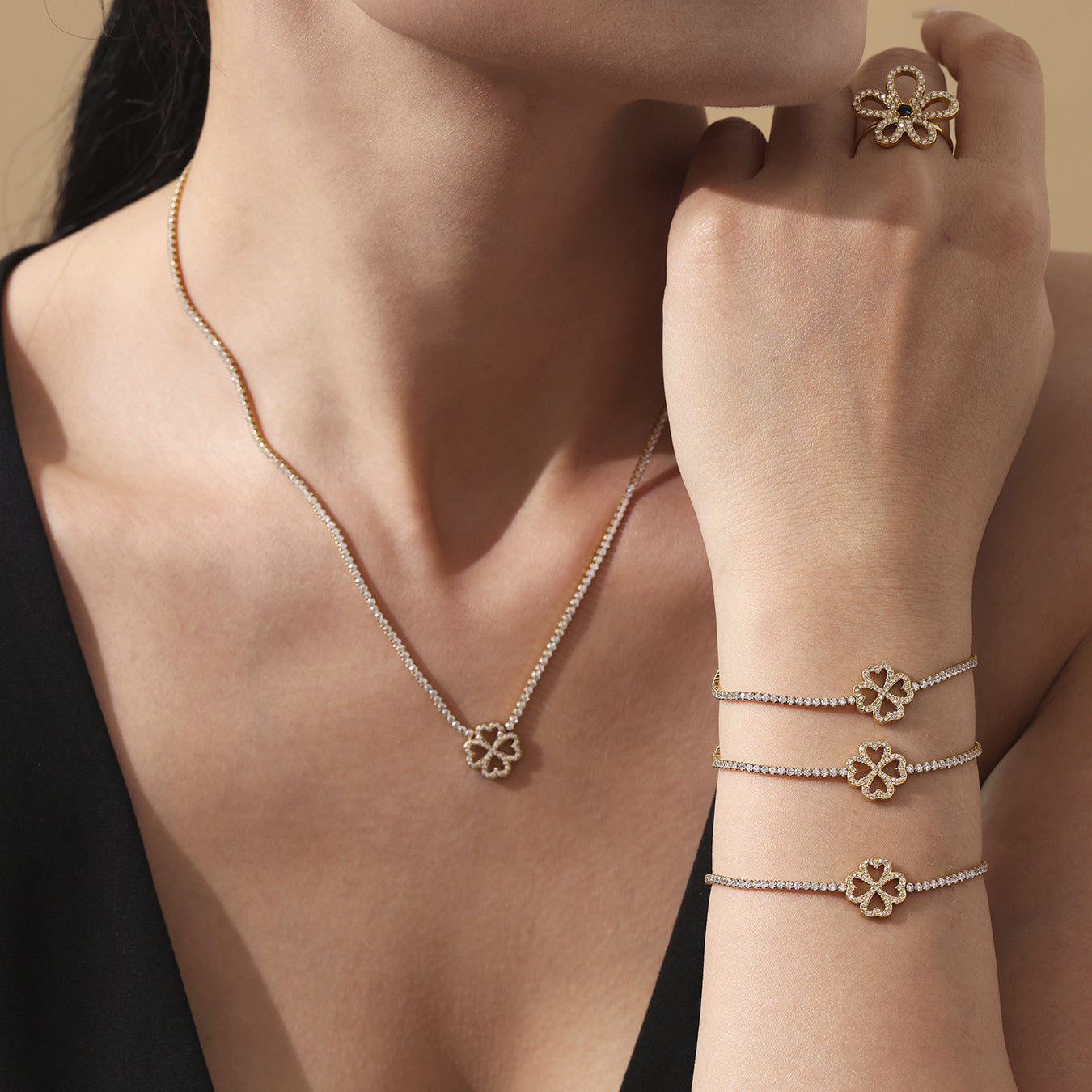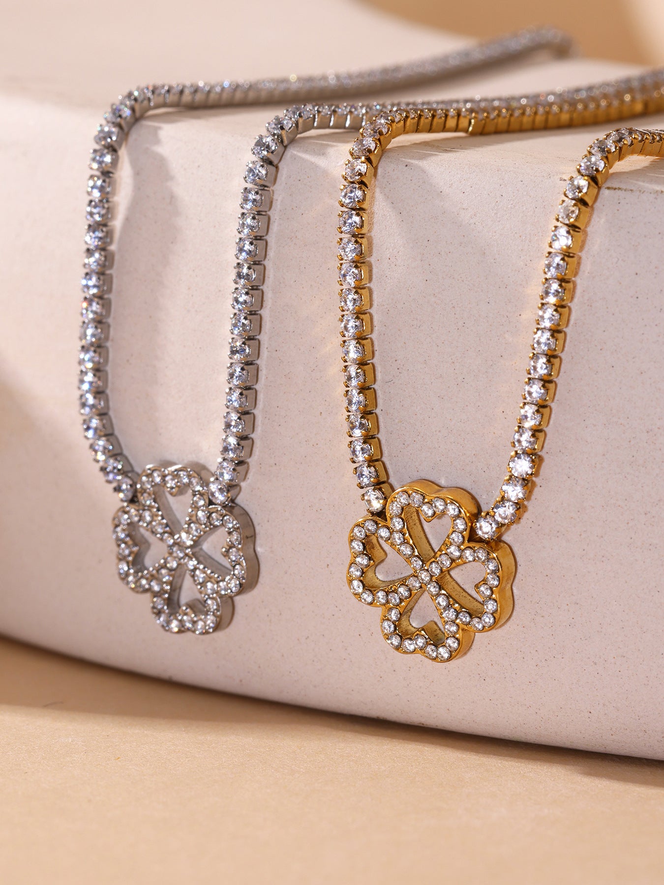 B廠【TXP300】超閃5A鋯石2mm鑽四葉花愛心手鍊項鍊組不鏽鋼鍍18k金飾品 25.07-1