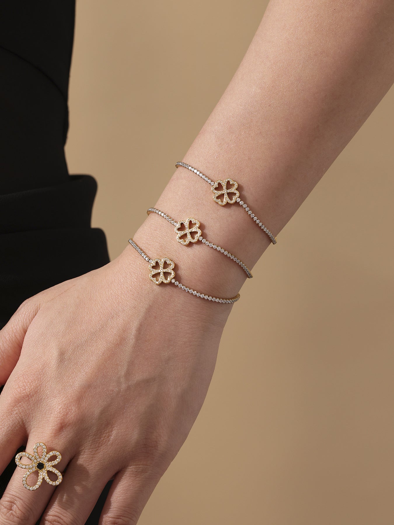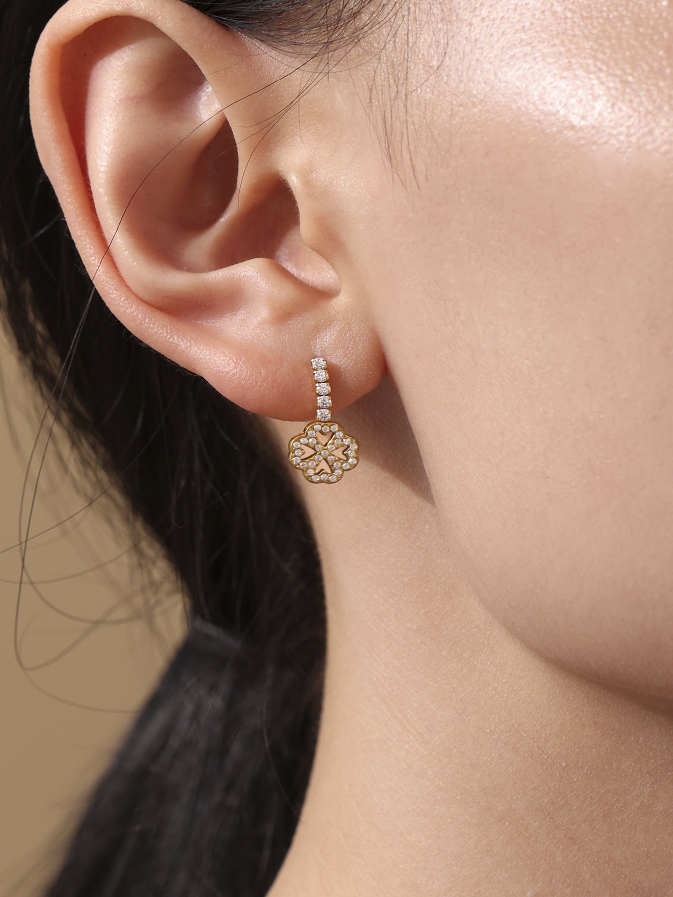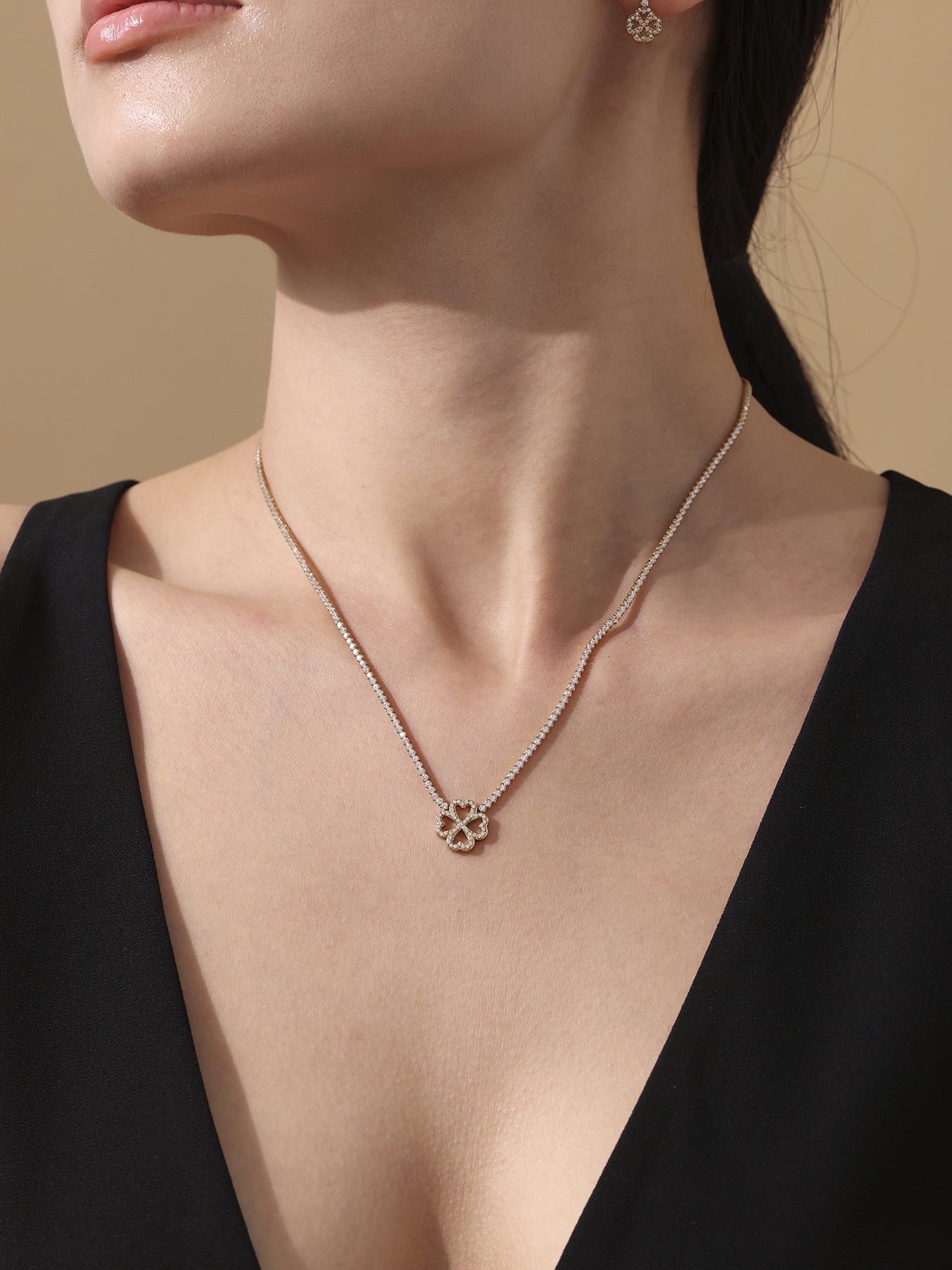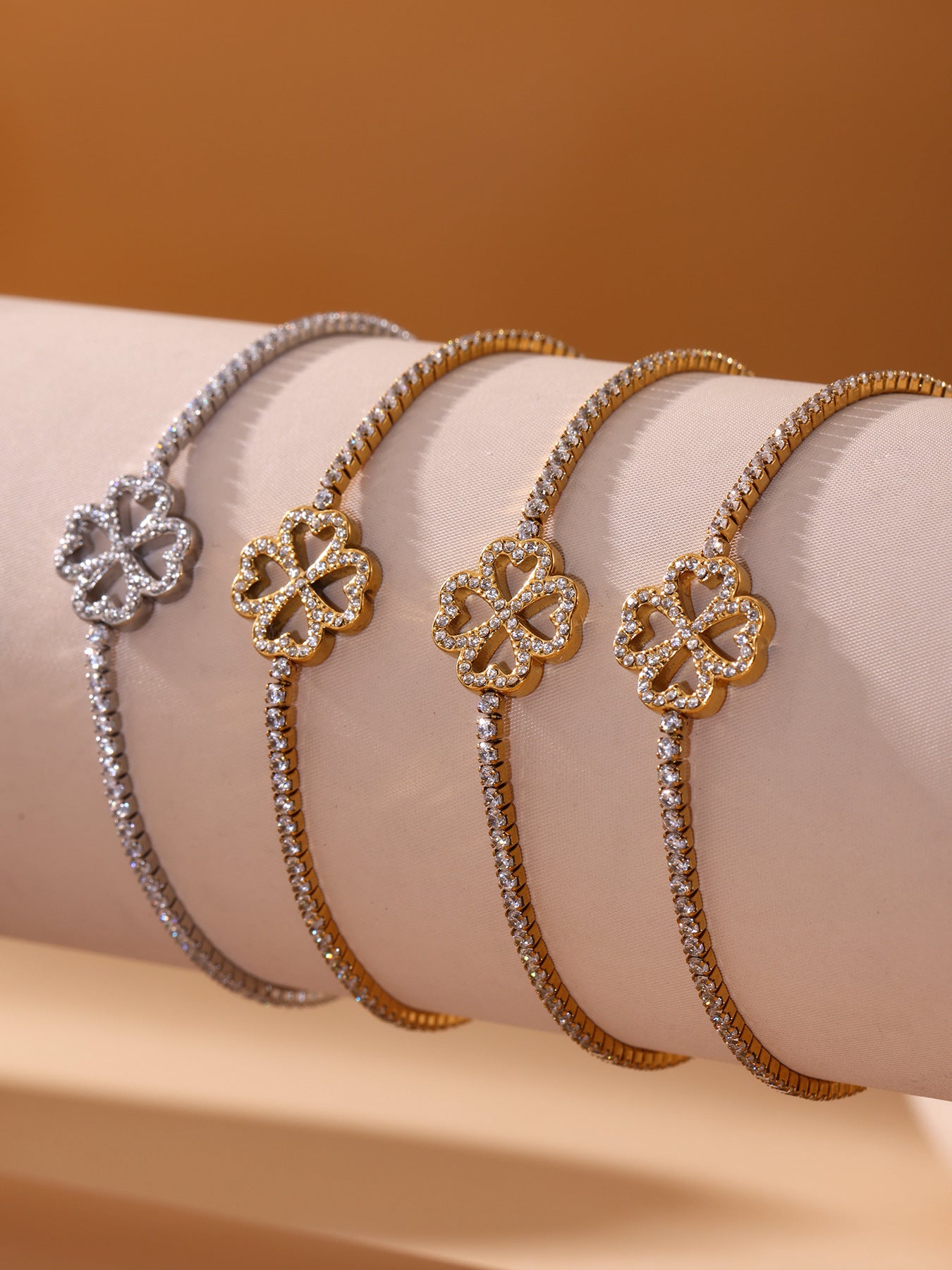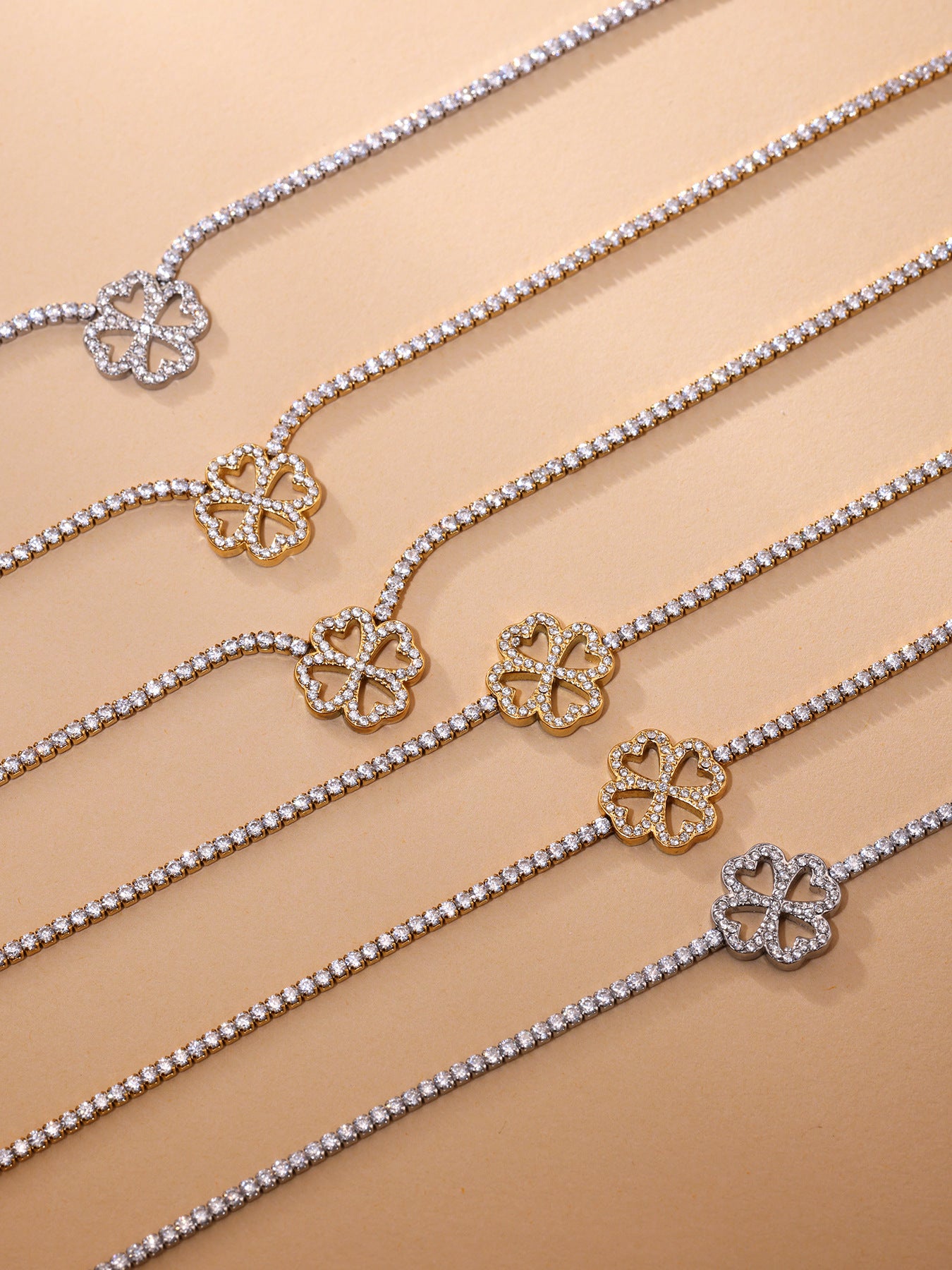 B廠【TXP300】超閃5A鋯石2mm鑽四葉花愛心手鍊項鍊組不鏽鋼鍍18k金飾品 25.07-1