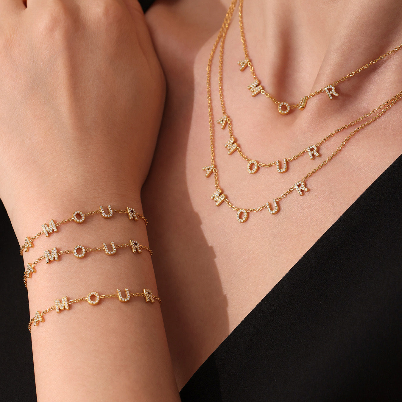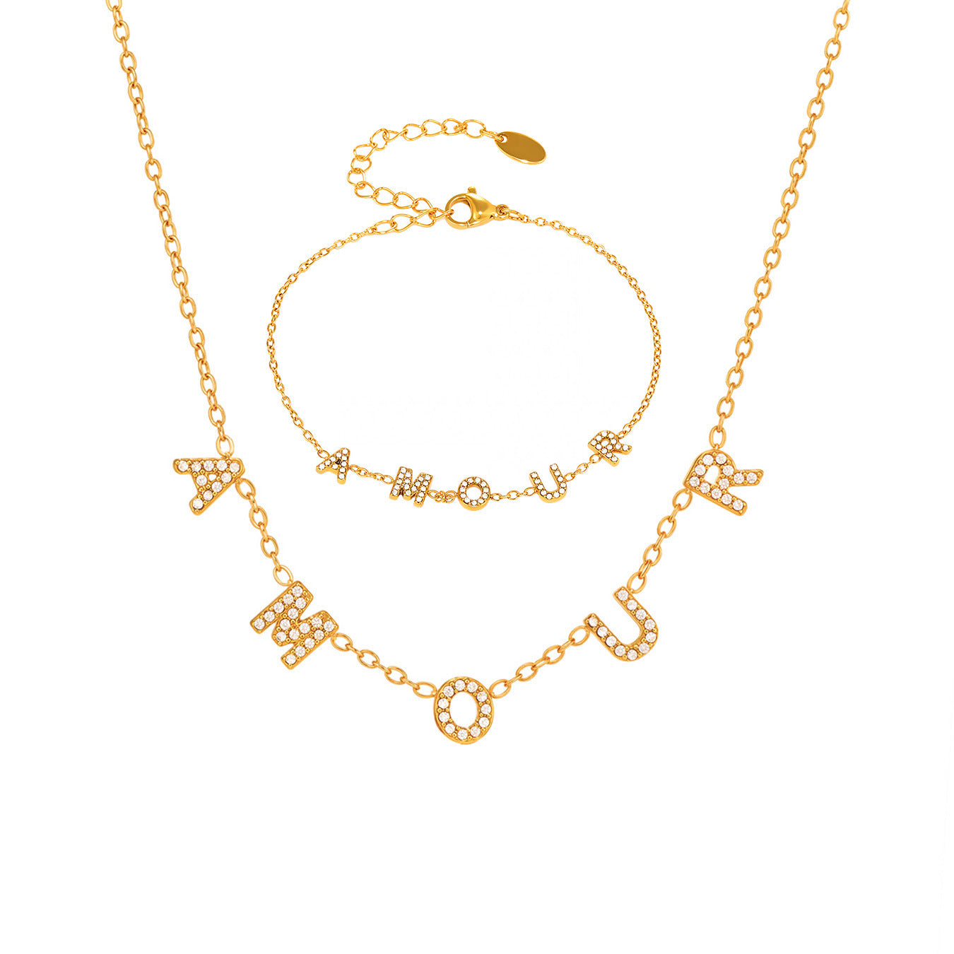 B廠【TXP304】5A鋯石AMOUR字母鎖骨項鍊手鍊飾品組不銹鋼材質鍍18k真金 25.07-2