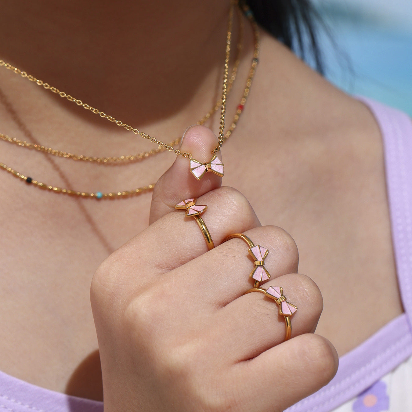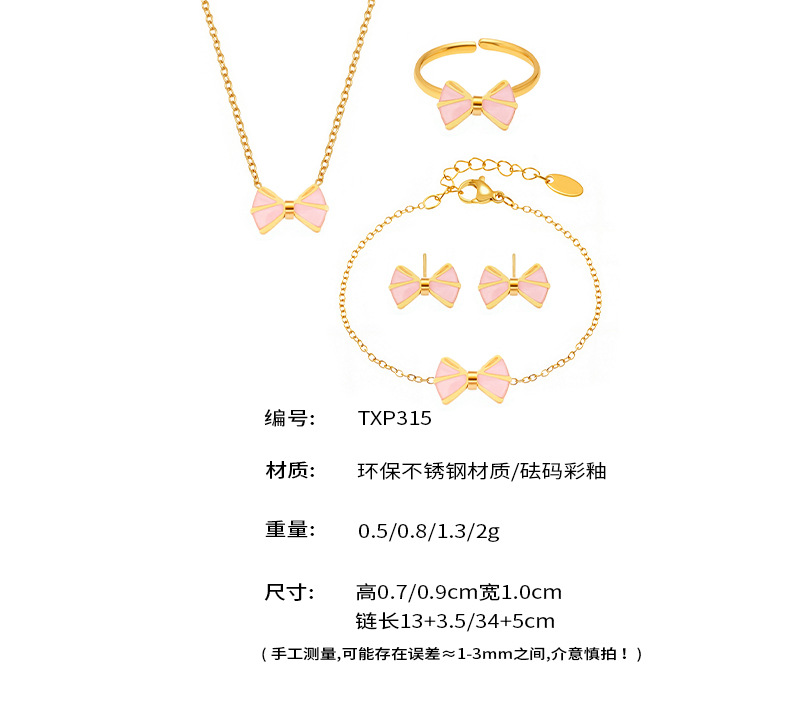 B廠【TXP315】不鏽鋼新款飾品粉紅色蝴蝶結耳環戒指手鍊項鍊腳鍊套裝 25.07-3