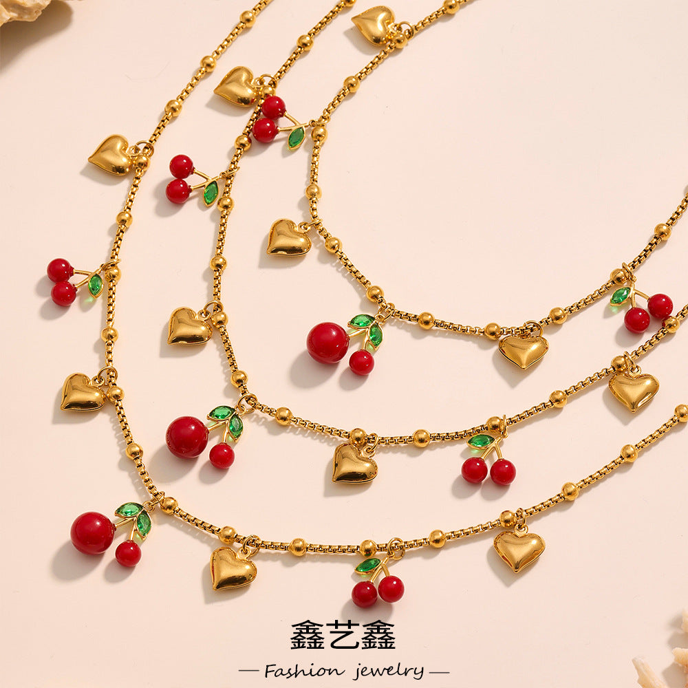 B廠【TXP327】不銹鋼愛心櫻桃DIY吊墜項鍊手鍊耳環套裝夏日精美女士飾品 25.08-1