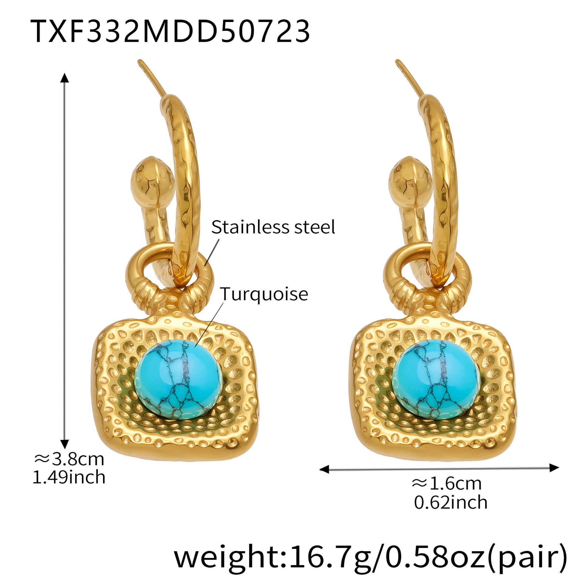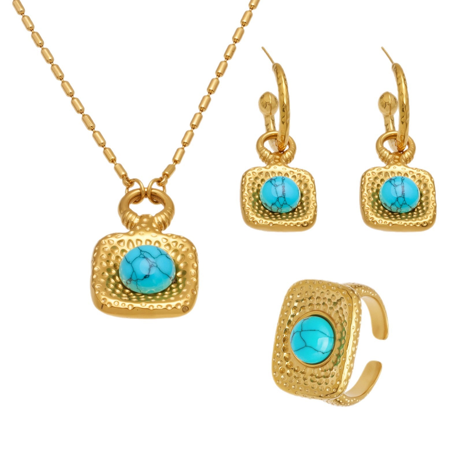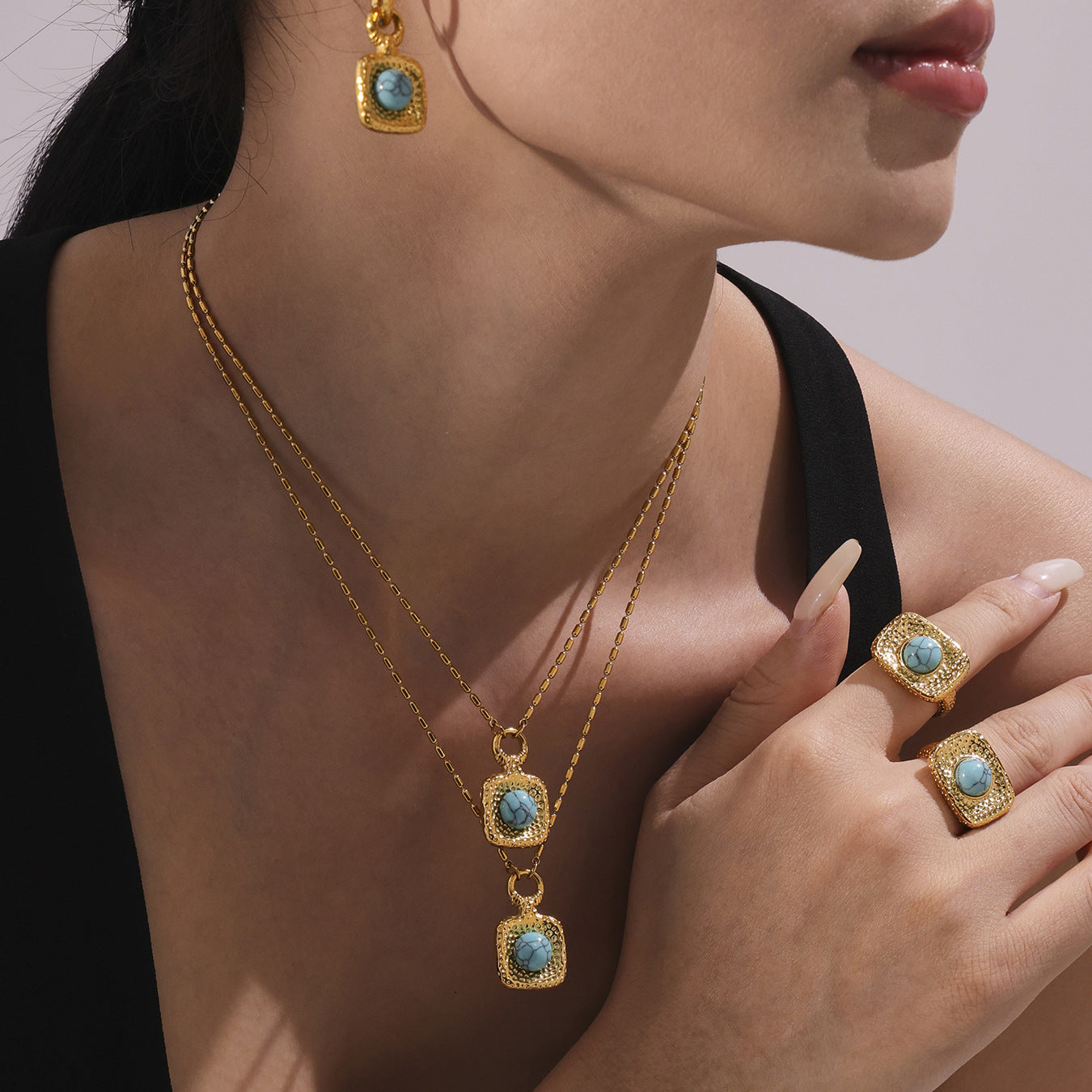 B廠【TXP332】新款不銹鋼藍松石吊墜項鍊耳環戒指套裝歐美精緻飾品不掉色 25.08-1