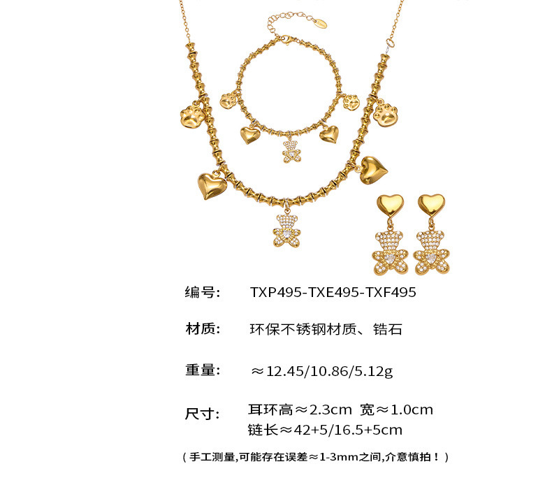 B廠【TXP495】不銹鋼小熊滿鑽鋯石竹節手工鏈空心愛心耳環手鍊項鍊套組女 25.11-4