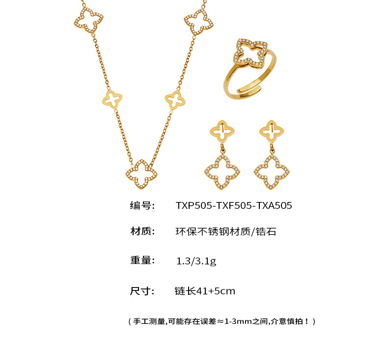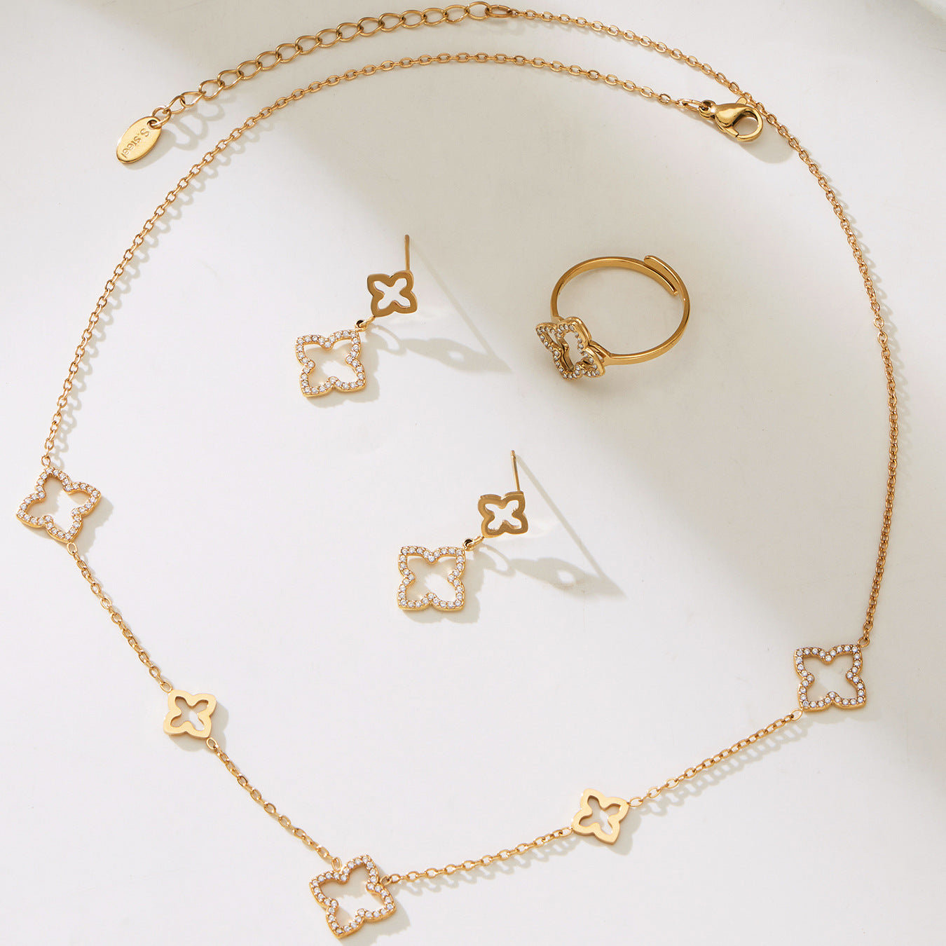 B廠【TXP505】不銹鋼鏤空花朵滿鑽鋯石耳環戒指項鍊簡約輕奢首飾組鍍18k真金 25.12-1