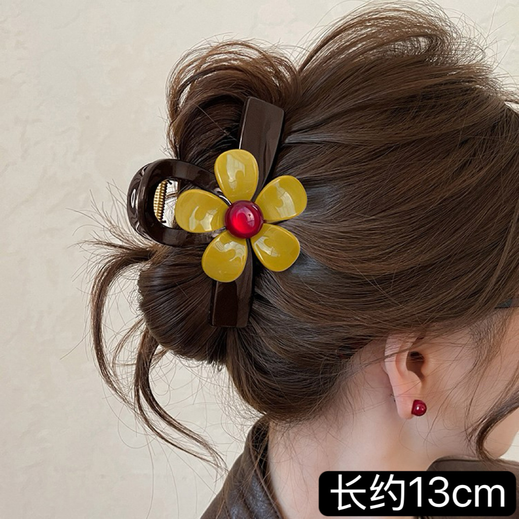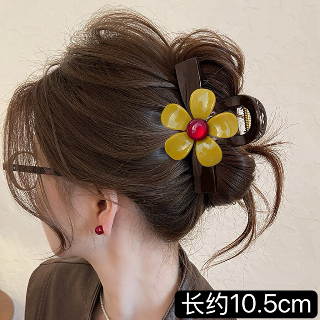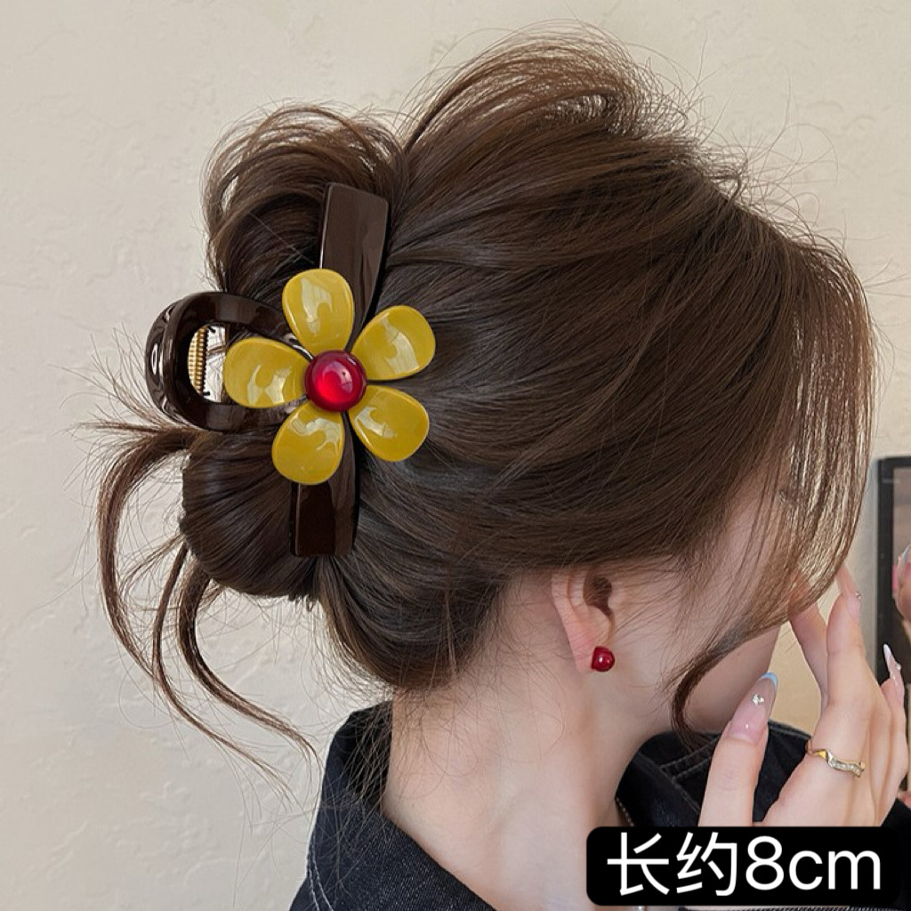 C廠【X157】紅珠花朵抓夾女2026新款巧克力棕色鯊魚夾高級感頭髮夾巨好看髮飾 26.04-4