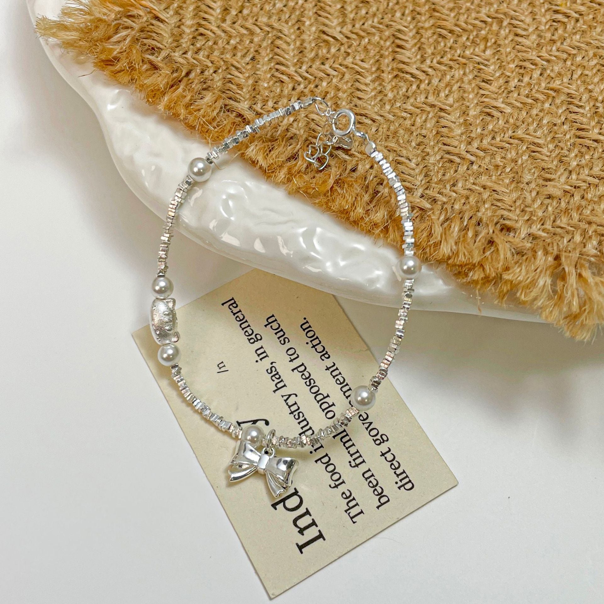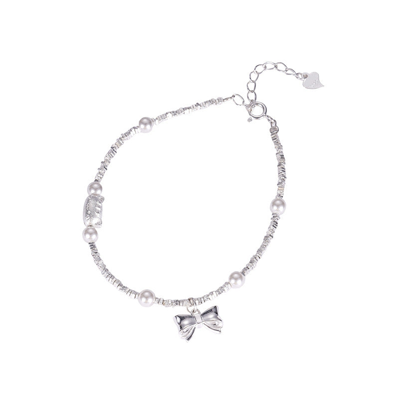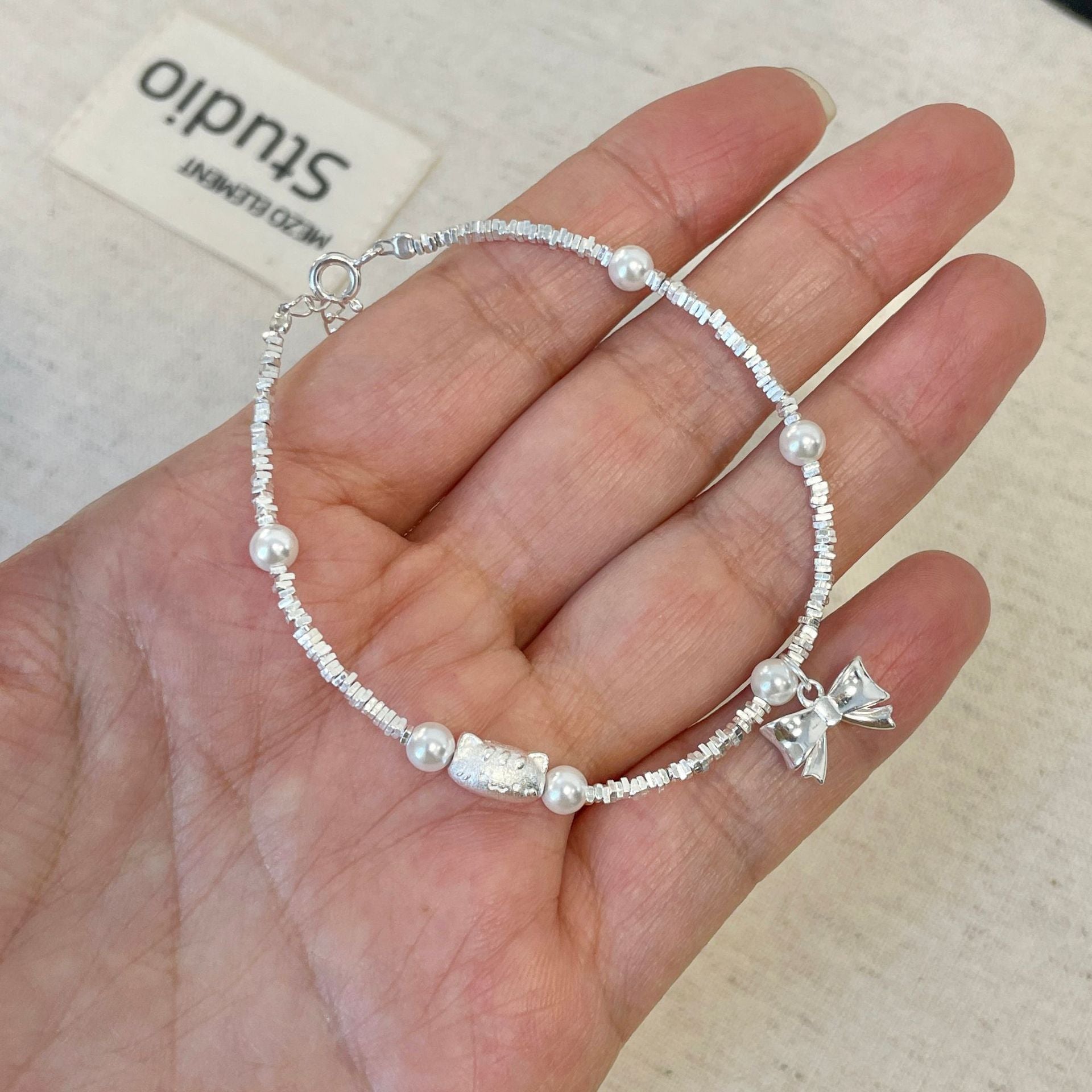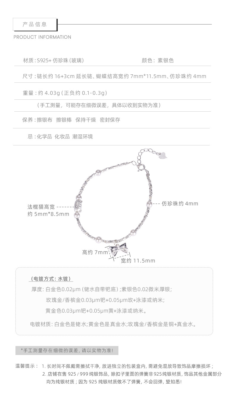 E廠【XDQ0797S】S925純銀精緻碎銀子蝴蝶結手鍊ins萌趣貓咪仿珍珠百搭手飾女 25.11-4
