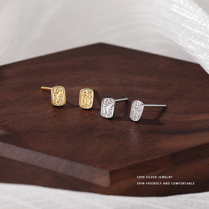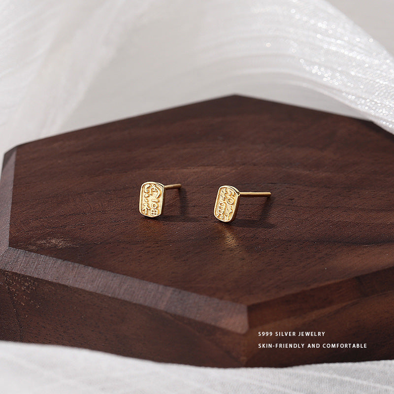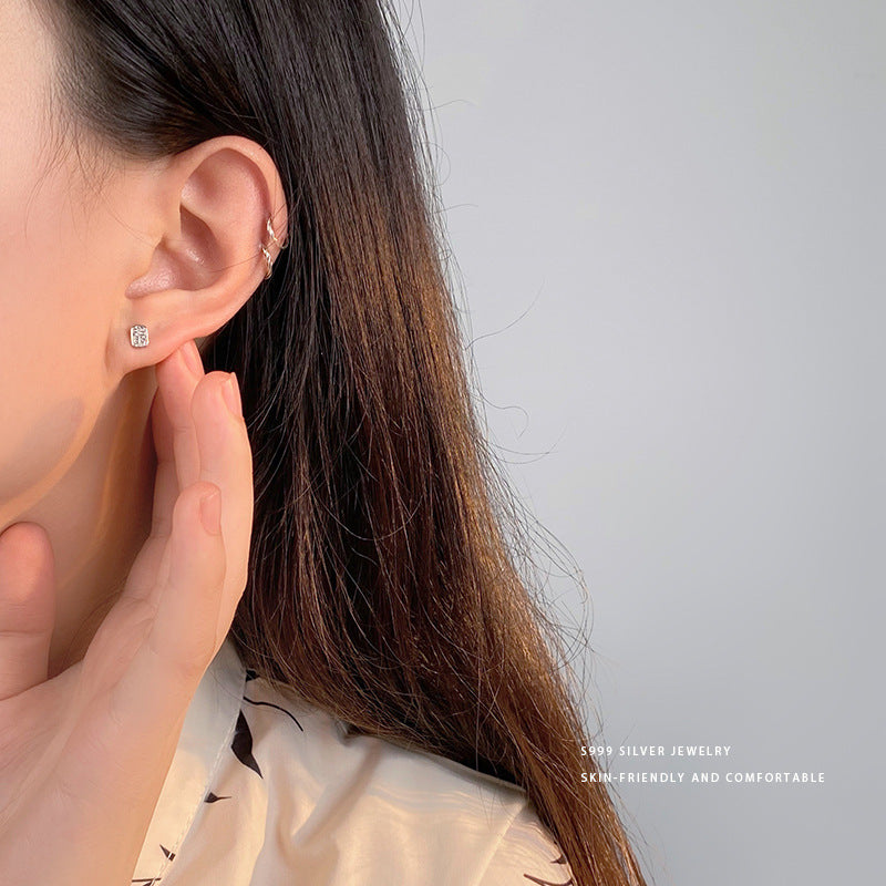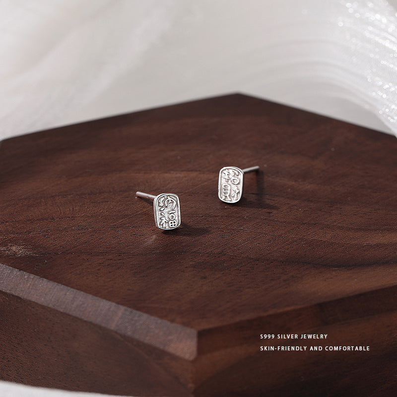 E廠【YC10028E】S999足銀國風漢字方牌耳環女國潮耳骨釘高級感輕奢耳飾品 24.05-4