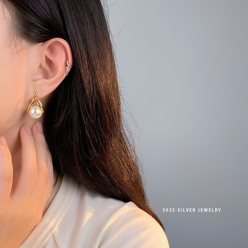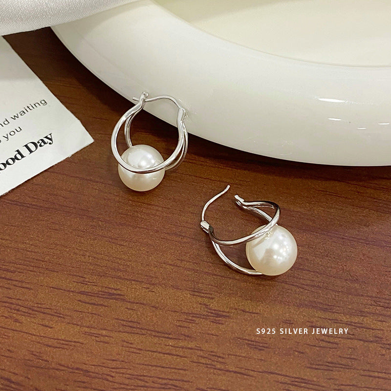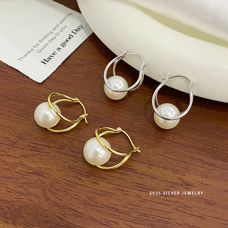 E廠【YC10175E】S925純銀簡約雙層幾何珍珠耳扣女氣質輕奢耳環小眾耳飾 24.06-2