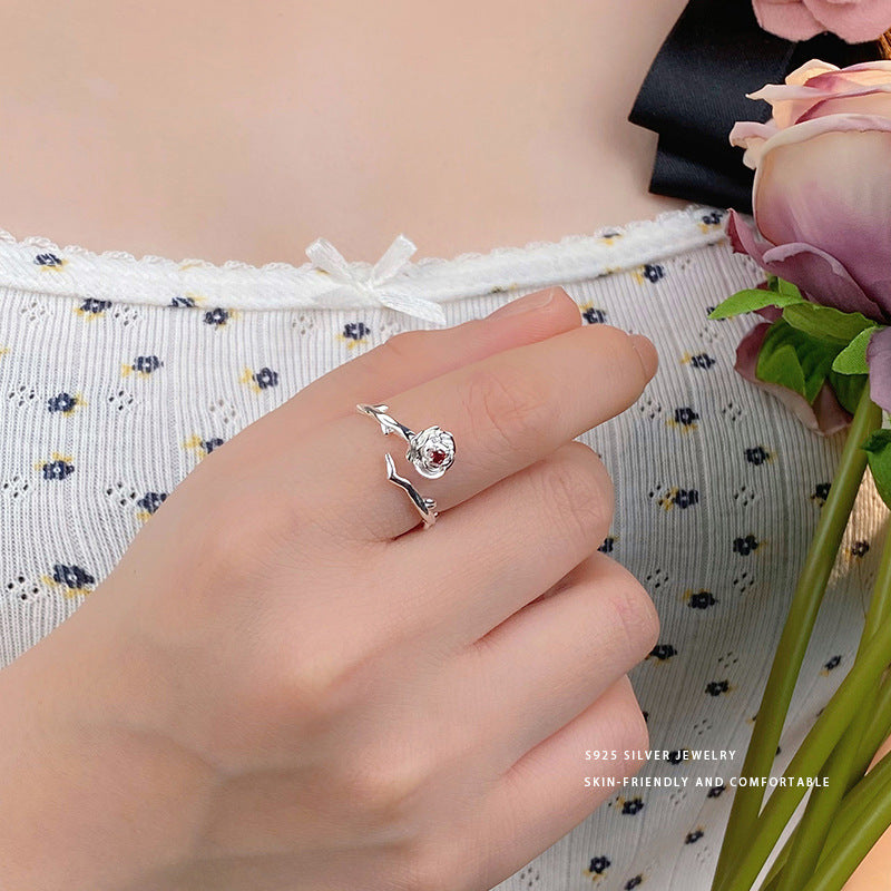 E廠【YC5458R】S925純銀精美玫瑰花枝戒指女小清新田園仙女風開口可調式戒指 24.04-4