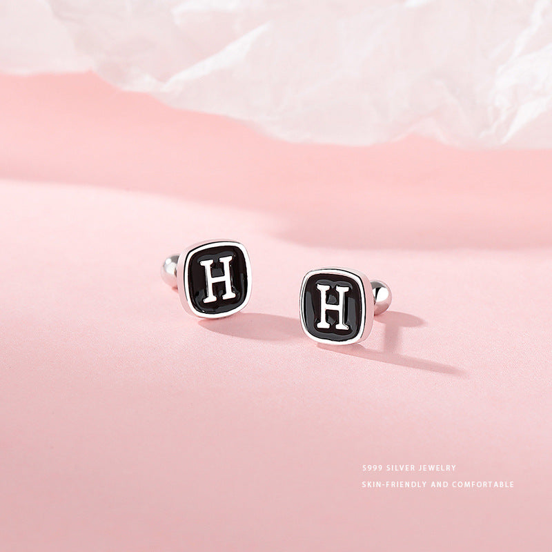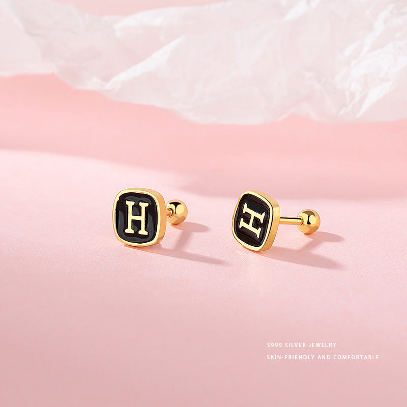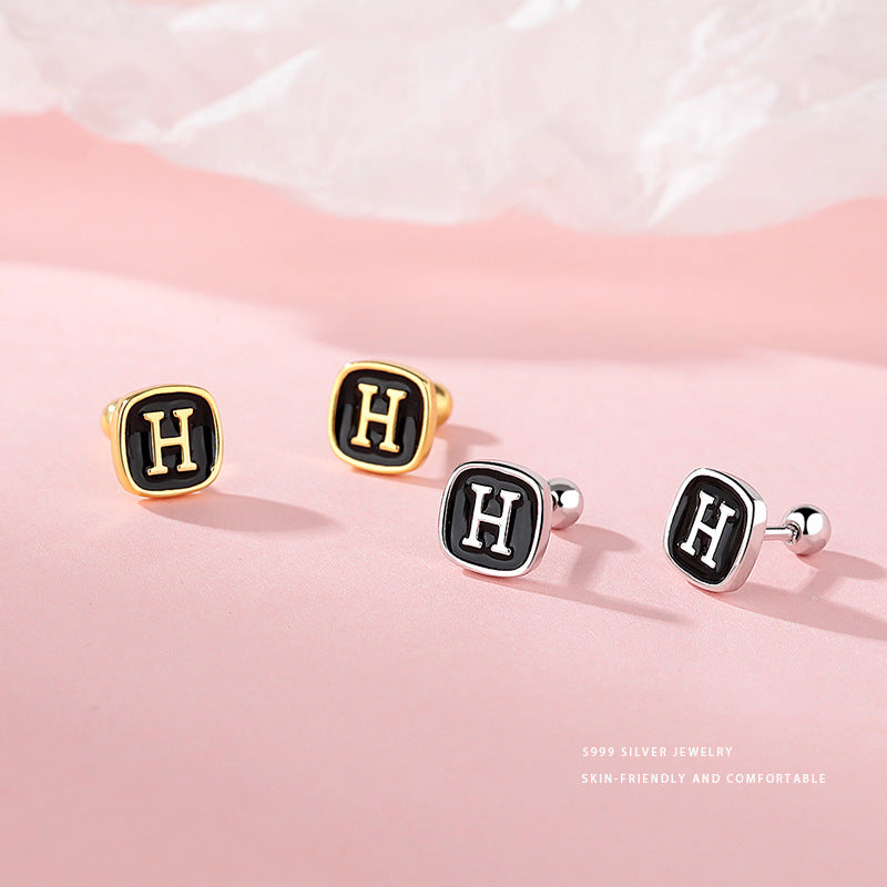 E廠【YC9783E】S999足銀時尚黑色滴膠H螺絲耳環女個性冷淡風高級感耳飾 24.03-3