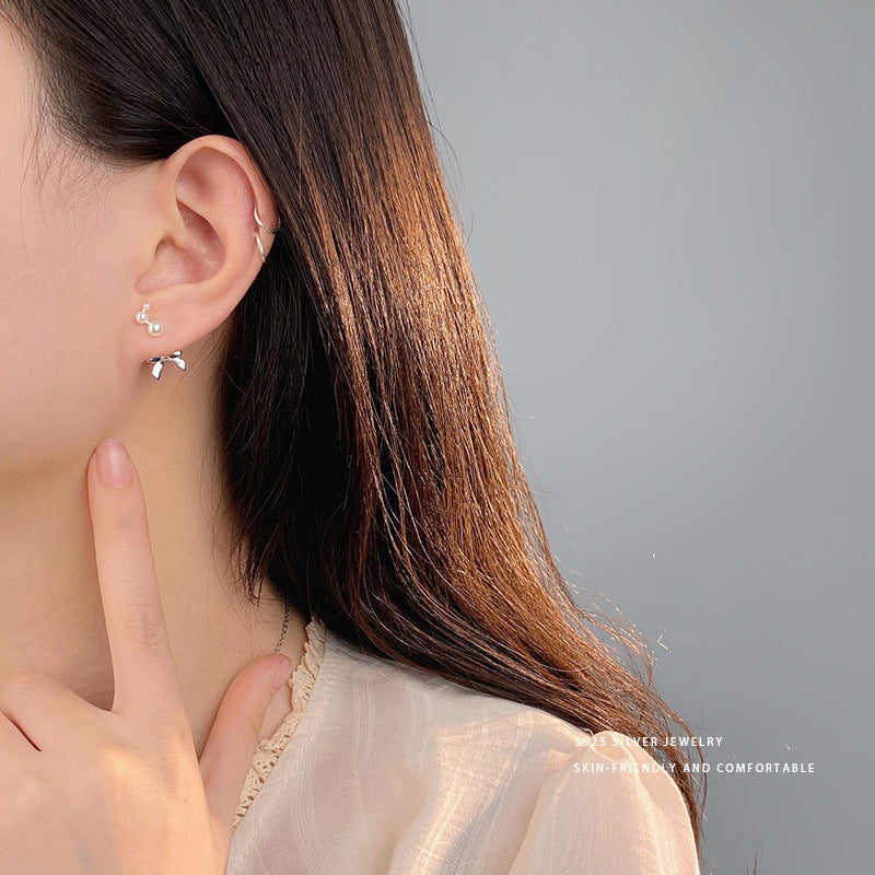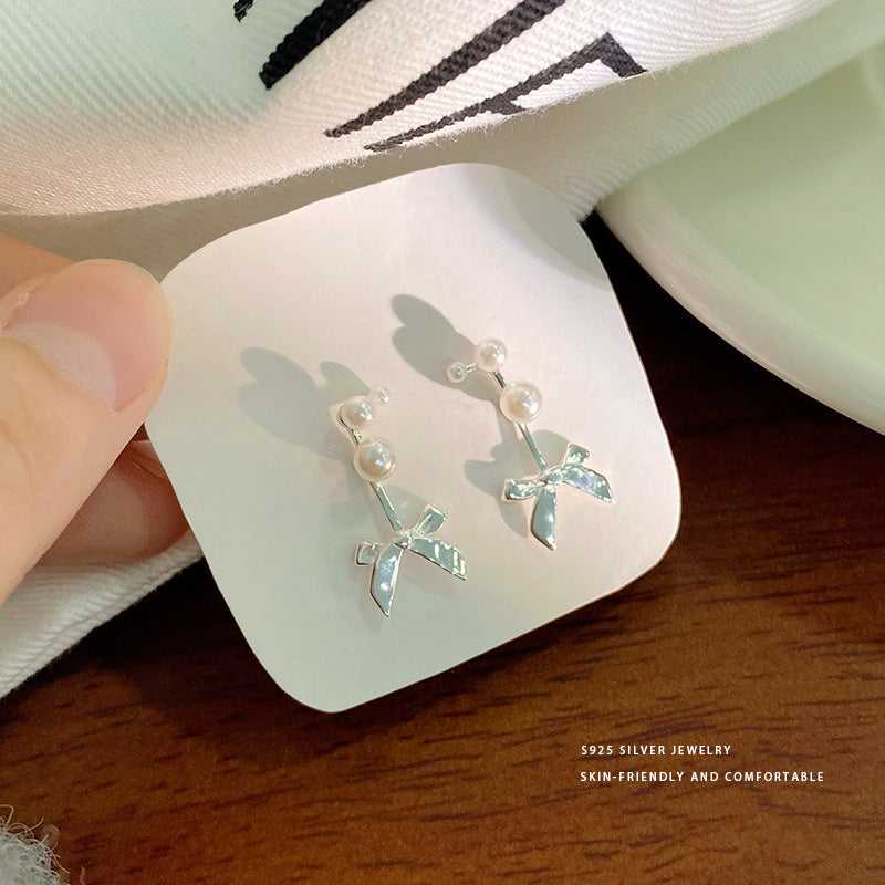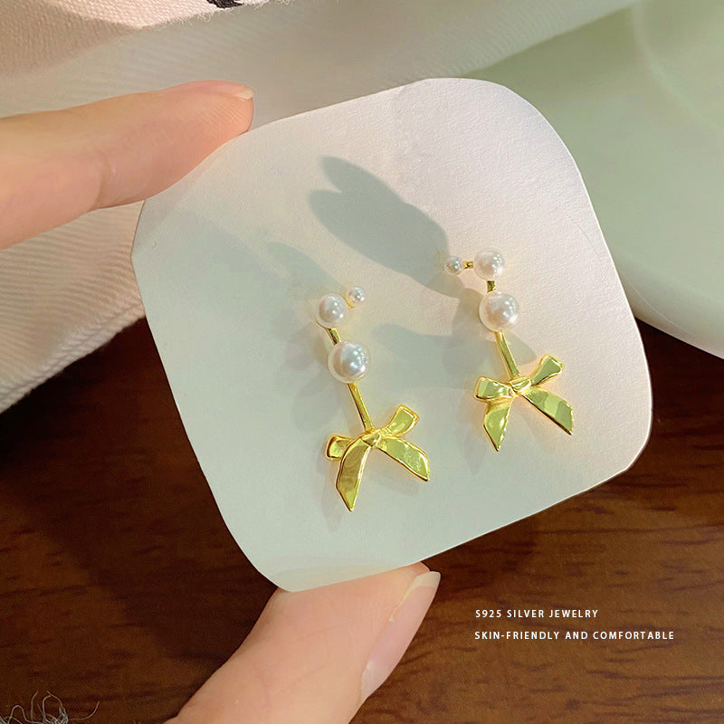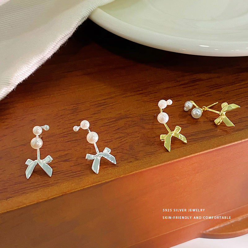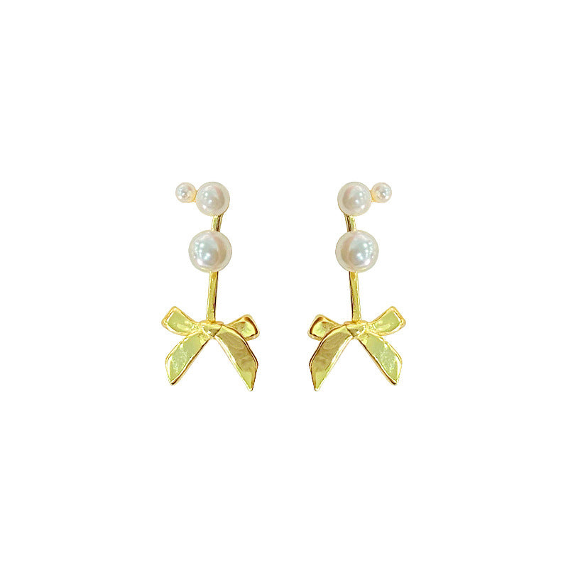 E廠【YC9839E】S925純銀甜珍珠蝴蝶結耳環女小眾法式少女感後掛式耳環 24.04-2