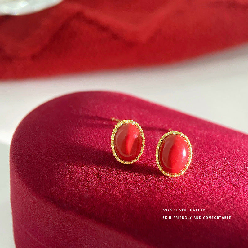 E廠【YC9889E】S925純銀本命年仿硃砂橢圓耳環女紅火喜慶高級感耳環耳環 24.02-1