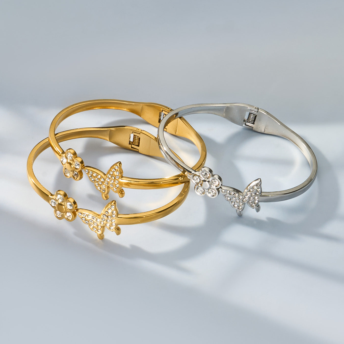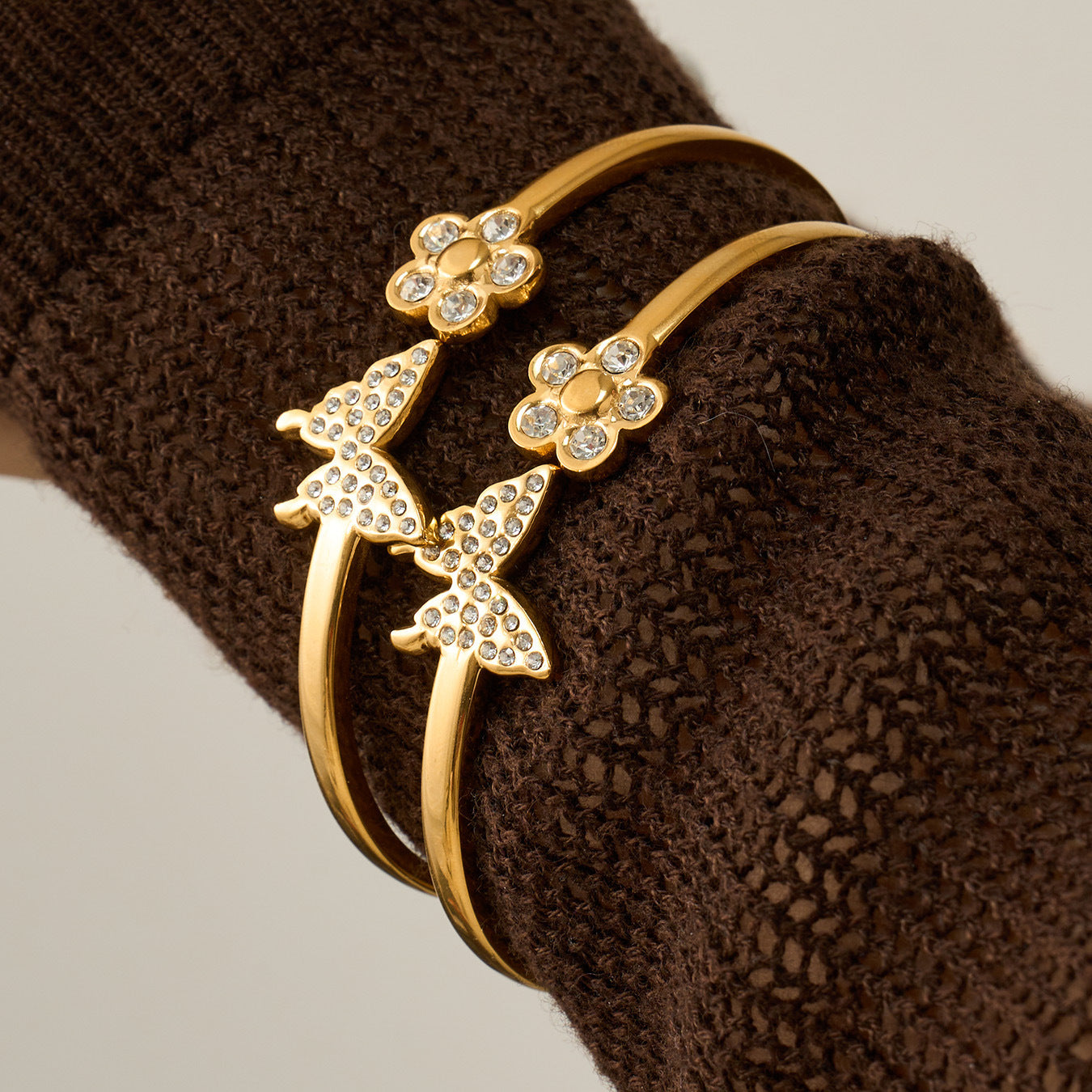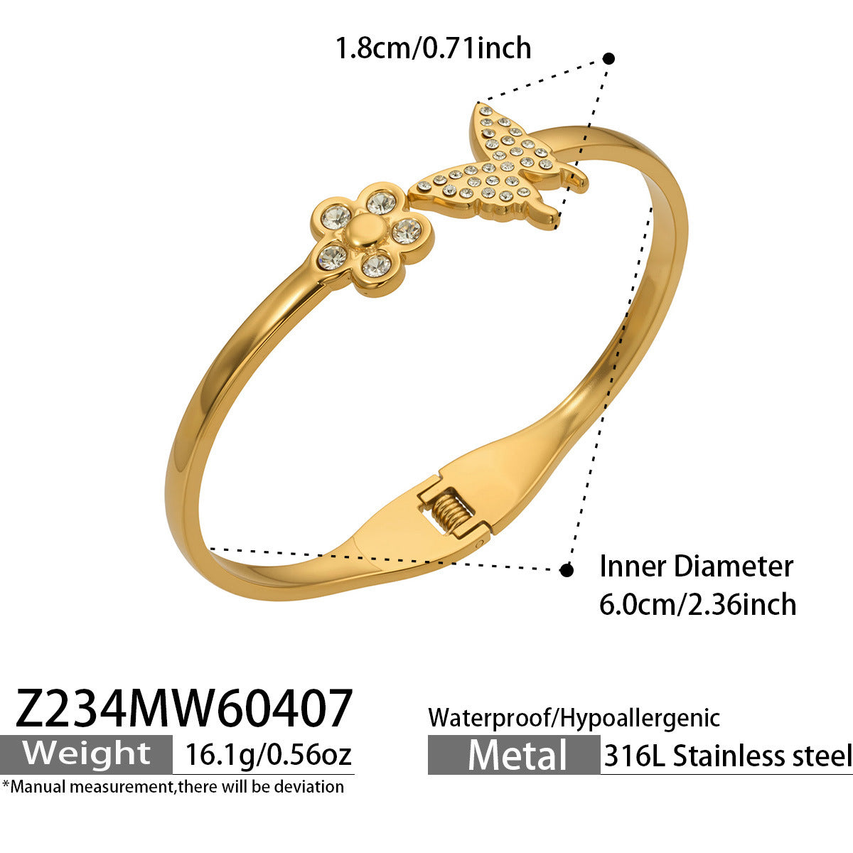 B廠【Z234】跨境時尚微鑲鋯石蝴蝶花朵彈簧開口手鐲網紅輕奢不鏽鋼18k金手環 26.04-3