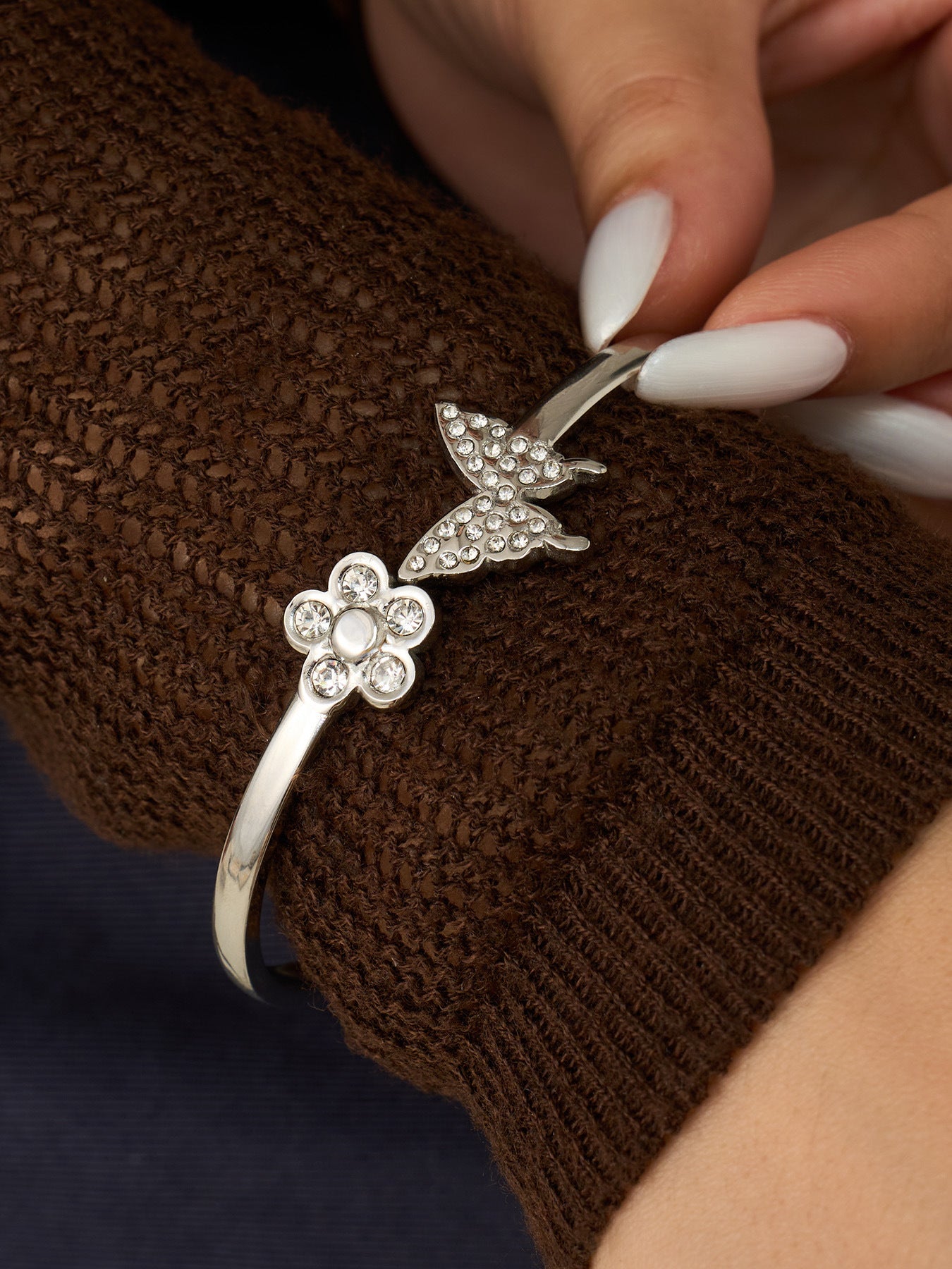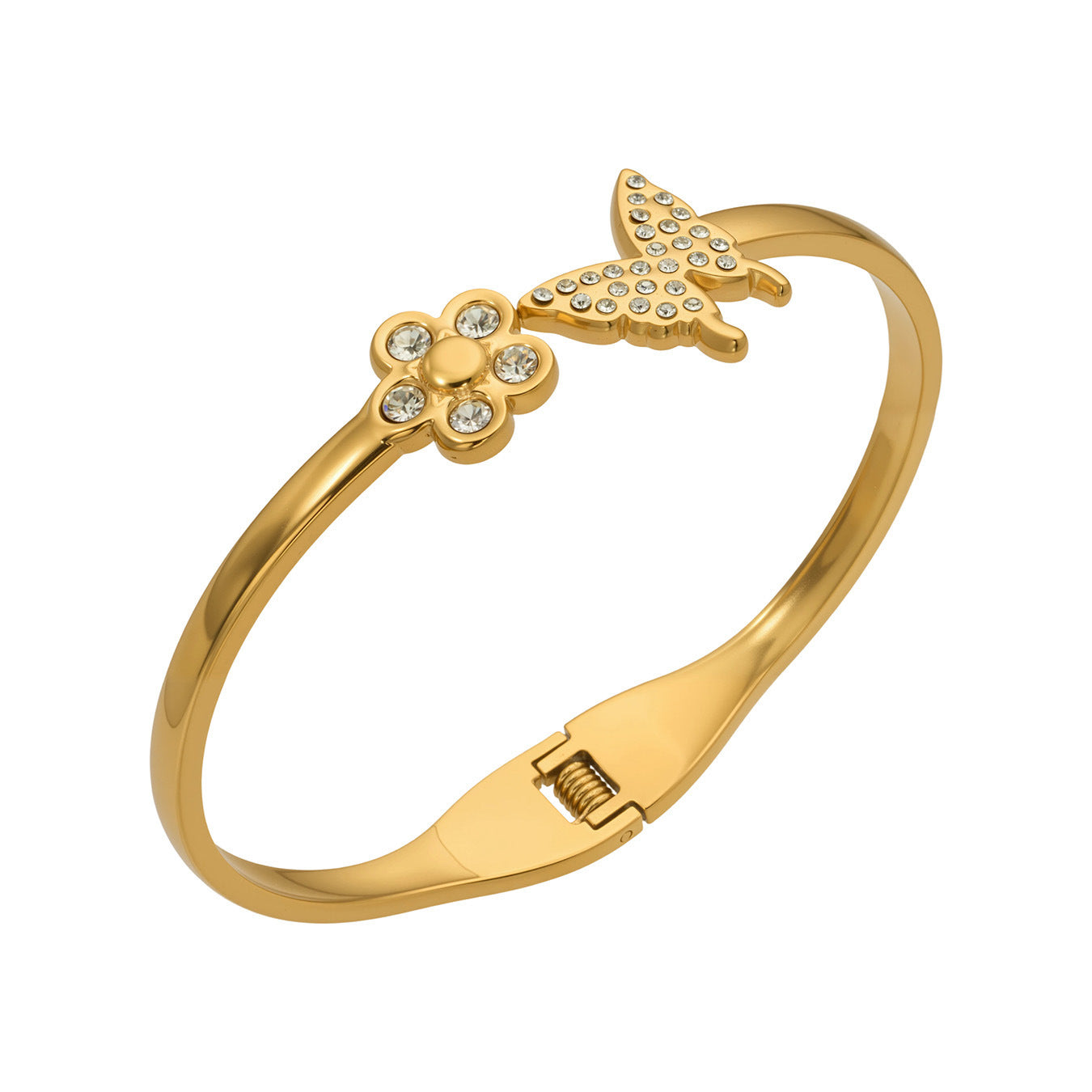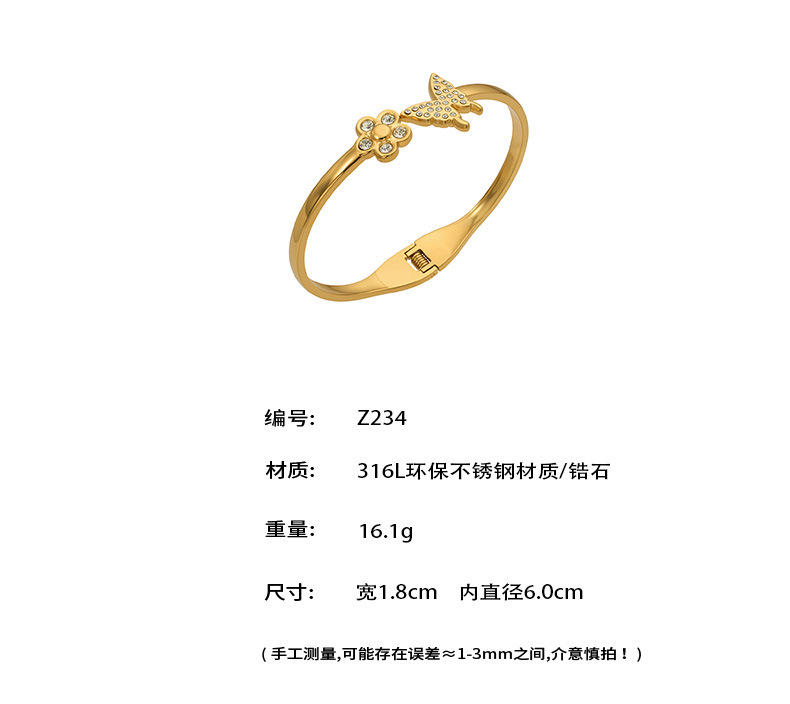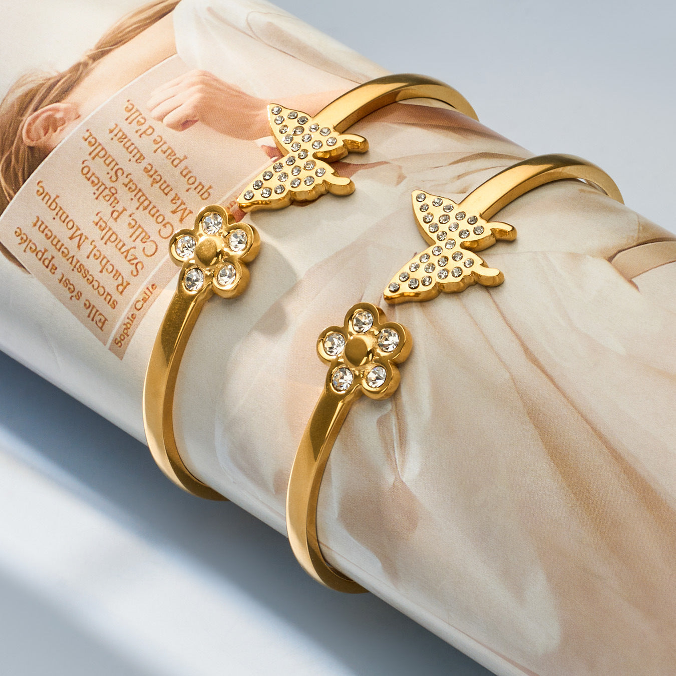 B廠【Z234】跨境時尚微鑲鋯石蝴蝶花朵彈簧開口手鐲網紅輕奢不鏽鋼18k金手環 26.04-3
