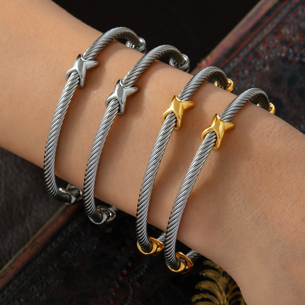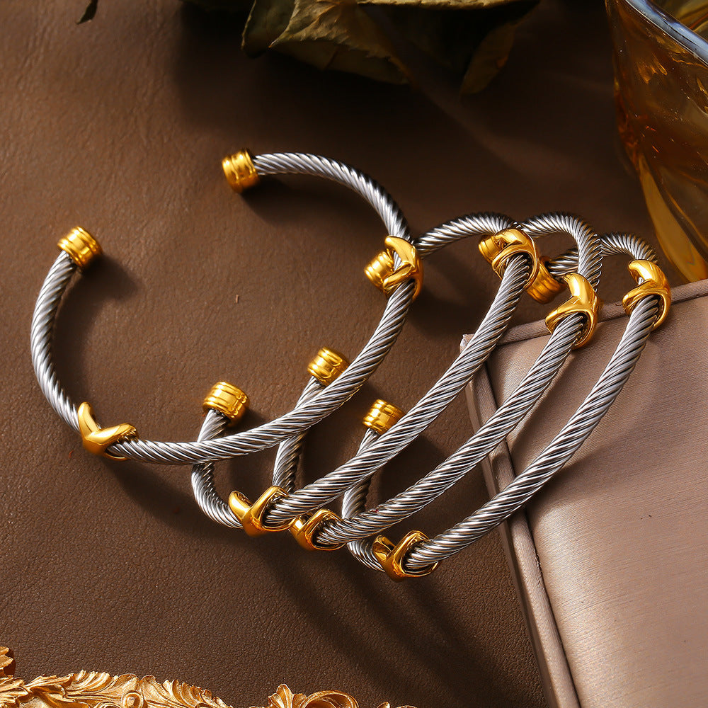 B廠【Z340】歐美復古個性金色鋼色螺紋輕奢風不銹鋼閃耀嘻哈不褪色手鐲女飾品 24.07-2