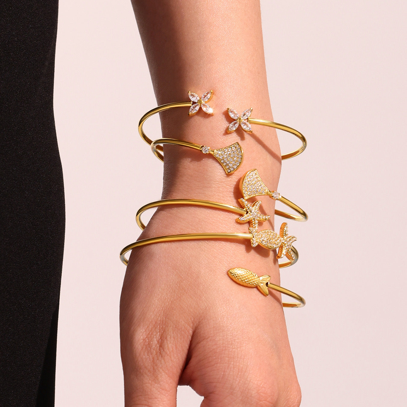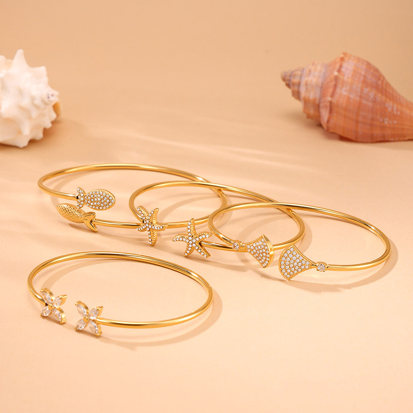 B廠【Z440】海洋沙灘風幾何海星造型鑲5A鋯石開口手鐲不鏽鋼鍍18k真金 25.06-4
